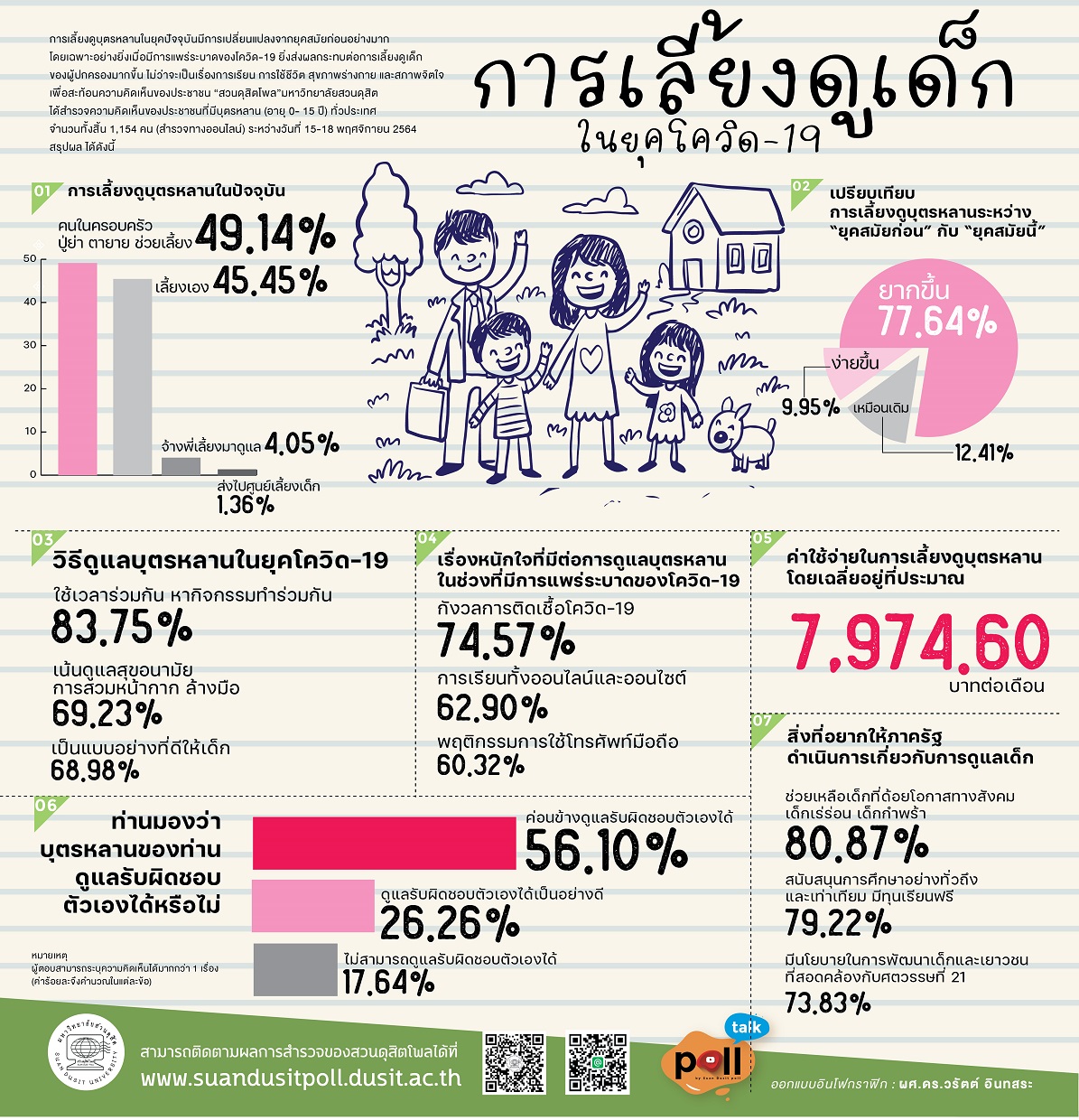 การแพร่ระบาดของโควิด-19 ส่งผลกระทบต่อรูปแบบการเลี้ยงดูเด็กของผู้ปกครองไทยอย่างมีนัยสำคัญ ทั้งในด้านการเรียนรู้ สุขภาพจิต และความมั่นคงในชีวิต สวนดุสิตโพล มหาวิทยาลัยสวนดุสิต ได้สำรวจความคิดเห็นของประชาชนที่มีบุตรหลานอายุ 0–15 ปี จำนวน 1,154 คน ระหว่างวันที่ 15–18 พฤศจิกายน 2564 พบว่า รูปแบบการเลี้ยงดูในครอบครัวเปลี่ยนไป โดยร้อยละ 49.14 อาศัยผู้สูงวัยในครอบครัวเป็นผู้ดูแล และร้อยละ 77.64 เห็นว่าการเลี้ยงดูเด็กในปัจจุบันยากขึ้น