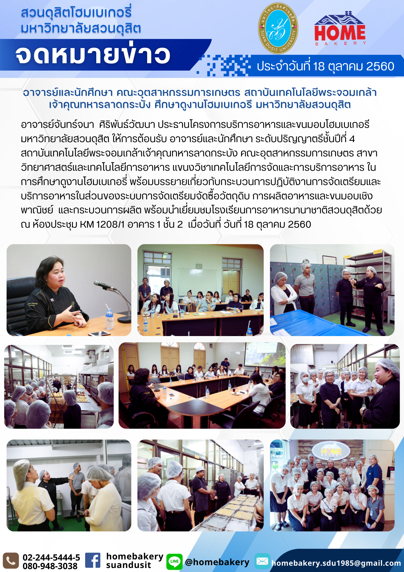 อาจารย์จันทร์จนา ศิริพันธ์วัฒนา ประธานโครงการบริการอาหารและขนมอบโฮมเบเกอรี มหาวิทยาลัยสวนดุสิต ให้การต้อนรับ อาจารย์และนักศึกษา ระดับปริญญาตรีชั้นปีที่ 4 สถาบันเทคโนโลยีพระจอมเกล้าเจ้าคุณทหารลาดกระบัง คณะอุตสาหกรรมการเกษตร สาขาวิทยาศาสตร์และเทคโนโลยีการอาหาร แขนงวิชาเทคโนโลยีการจัดและการบริการอาหาร ในการศึกษาดูงานโฮมเบเกอรี่ พร้อมบรรยายเกี่ยวกับกระบวนการปฏิบัติงานการจัดเตรียมและบริการอาหารในส่วนของระบบการจัดเตรียมจัดซื้อวัตถุดิบ การผลิตอาหารและขนมอบเชิงพาณิชย์ และกระบวนการผลิต พร้อมนำเยี่ยมชมโรงเรียนการอาหารนานาชาติสวนดุสิตด้วย ณ ห้องประชุม KM 1208/1 อาคาร 1 ชั้น 2 เมื่อวันที่ วันที่ 18 ตุลาคม 2560