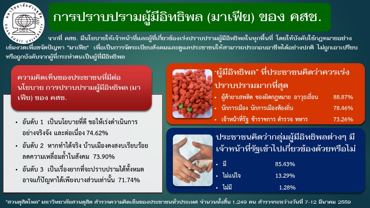 จากสถานการณ์การใช้อำนาจรัฐเพื่อปราบปรามผู้มีอิทธิพลในสังคมไทย คณะรักษาความสงบแห่งชาติ (คสช.) ได้ดำเนินนโยบายเพื่อจัดระเบียบและยุติพฤติกรรมของกลุ่มบุคคลที่มีอิทธิพลในลักษณะมาเฟีย ซึ่งมักแสวงหาผลประโยชน์จากประชาชนอย่างไม่เป็นธรรม เพื่อสะท้อนความคิดเห็นของประชาชนเกี่ยวกับนโยบายดังกล่าว "สวนดุสิตโพล" มหาวิทยาลัยสวนดุสิต ได้ทำการสำรวจประชาชนทั่วประเทศจำนวน 1,249 คน ระหว่างวันที่ 7–12 มีนาคม 2559 พบว่า ประชาชนส่วนใหญ่เห็นด้วยกับนโยบายนี้ และต้องการให้ดำเนินการอย่างจริงจัง โดยกลุ่มผู้มีอิทธิพลที่ควรเร่งจัดการมากที่สุด ได้แก่ ผู้ค้ายาเสพติด นักการเมือง และเจ้าหน้าที่รัฐ นอกจากนี้ ประชาชนส่วนใหญ่เชื่อว่ามีเจ้าหน้าที่รัฐเกี่ยวข้องกับผู้มีอิทธิพล และชี้ให้เห็นว่าอุปสรรคสำคัญของการปราบปราม ได้แก่ ความกลัวในการร้องเรียน การรับสินบน และการใช้อำนาจในทางมิชอบ แนวทางการแก้ไขควรอาศัยความร่วมมือจากทุกฝ่าย การบังคับใช้กฎหมายอย่างเข้มงวด และการสร้างระบบตรวจสอบที่มีประสิทธิภาพ เพื่อสร้างความเชื่อมั่นและความปลอดภัยในสังคมไทยอย่างยั่งยืน