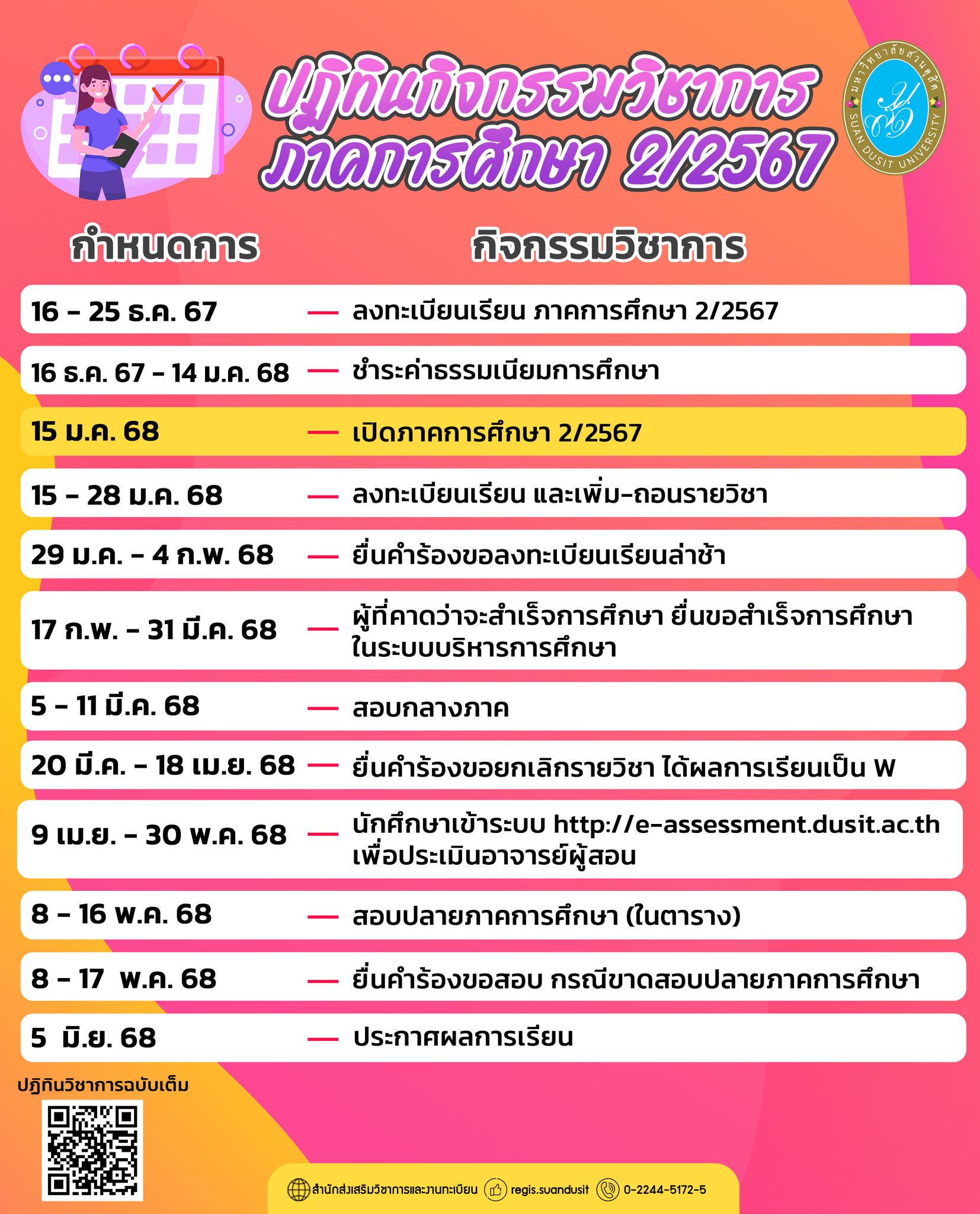 ปฏิทินกิจกรรมวิชาการ ภาคการศึกษา 2/2567 ของมหาวิทยาลัยสวนดุสิต โดยระบุวันสำคัญที่เกี่ยวข้องกับการลงทะเบียน การเรียน และการสอบของนักศึกษา เช่น