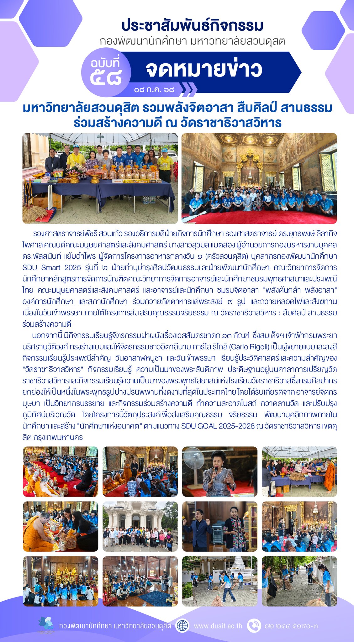 รองศาสตราจารย์พัชรี สวนแก้ว รองอธิการบดีฝ่ายกิจการนักศึกษา รองศาสตราจารย์ ดร.ยุทธพงษ์ ลีลากิจไพศาล คณบดีคณะมนุษยศาสตร์และสังคมศาสตร์ นางสาวสุวิมล แมตสอง ผู้อำนวยการกองบริหารงานบุคคล ดร.พัสสนันท์ แย้มฉ่ำไพร ผู้จัดการโครงการอาหารกลางวัน ๑ (ครัวสวนดุสิต) บุคลากรกองพัฒนานักศึกษา SDU Smart 2025 รุ่นที่ ๒ ฝ่ายทำนุบำรุงศิลปวัฒนธรรมและฝ่ายพัฒนานักศึกษา คณะวิทยาการจัดการ นักศึกษาหลักสูตรการจัดการบัณฑิตคณะวิทยาการจัดการอาจารย์และนักศึกษาชมรมพุทธศาสนาและประเพณีไทย คณะมนุษยศาสตร์และสังคมศาสตร์ และอาจารย์และนักศึกษา ชมรมจิตอาสา "พลังต้นกล้า พลังอาสา" องค์การนักศึกษา และสภานักศึกษา ร่วมถวายภัตตาหารแด่พระสงฆ์ ๙ รูป และถวายหลอดไฟและสังฆทาน เนื่องในวันเข้าพรรษา ภายใต้โครงการส่งเสริมคุณธรรมจริยธรรม ณ วัดราชาธิวาสวิหาร : สืบศิลป์ สานธรรม ร่วมสร้างความดี นอกจากนี้ มีกิจกรรมเรียนรู้จิตรกรรมฝาผนังเรื่องเวสสันดรชาดก ๑๓ กัณฑ์ ซึ่งสมเด็จฯ เจ้าฟ้ากรมพระยานริศรานุวัดติวงศ์ ทรงร่างแบบและให้จิตรกรรมชาวอิตาลีนาม คาร์โล ริโก ลี (Carlo Rigoli) เป็นผู้ขยายแบบและลงสี กิจกรรมเรียนรู้ประเพณีสำคัญ วันอาสาฬหบูชา และวันเข้าพรรษา เรียนรู้ประวัติศาสตร์และความสำคัญของ "วัดราชาธิวาสวิหาร" กิจกรรมเรียนรู้ ความเป็นมาของพระสันติภาพ ประดิษฐานอยู่บนศาลาการเปรียญวัดราชาธิวาสวิหารและกิจกรรมเรียนรู้ความเป็นมาของพระพุทธไสยาสน์แห่งโรงเรียนวัดราชาธิวาสซึ่งกรมศิลปากร ยกย่องให้เป็นหนึ่งในพระพุทธรูปปางปรินิพพานที่งดงามที่สุดในประเทศไทย โดยได้รับเกียรติจาก อาจารย์จิตรกร บุษบา เป็นวิทยากรบรรยาย และกิจกรรมร่วมสร้างความดี ทำความสะอาดโบสถ์ กวาดลานวัด และปรับปรุงภูมิทัศน์บริเวณวัด โดยโครงการนี้วัตถุประสงค์เพื่อส่งเสริมคุณธรรม จริยธรรม พัฒนาบุคลิกภาพภายในนักศึกษา และสร้าง "นักศึกษาแห่งอนาคต" ตามแนวทาง SDU GOAL 2025-2028 ณ วัดราชาธิวาสวิหาร เขตดุสิต กรุงเทพมหานคร