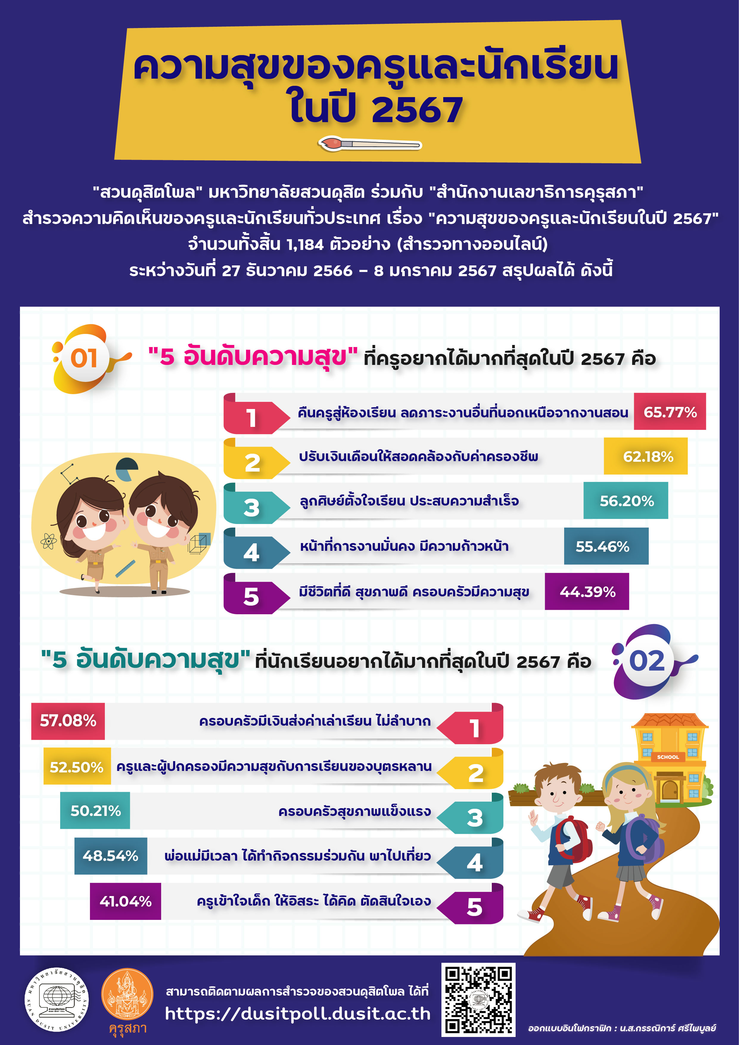 "สวนดุสิตโพล" มหาวิทยาลัยสวนดุสิต ร่วมกับสำนักงานเลขาธิการคุรุสภา ได้ทำการสำรวจความคิดเห็นของครูและนักเรียนทั่วประเทศเกี่ยวกับความสุขที่ต้องการในปี 2567 จากกลุ่มตัวอย่าง 1,184 คน