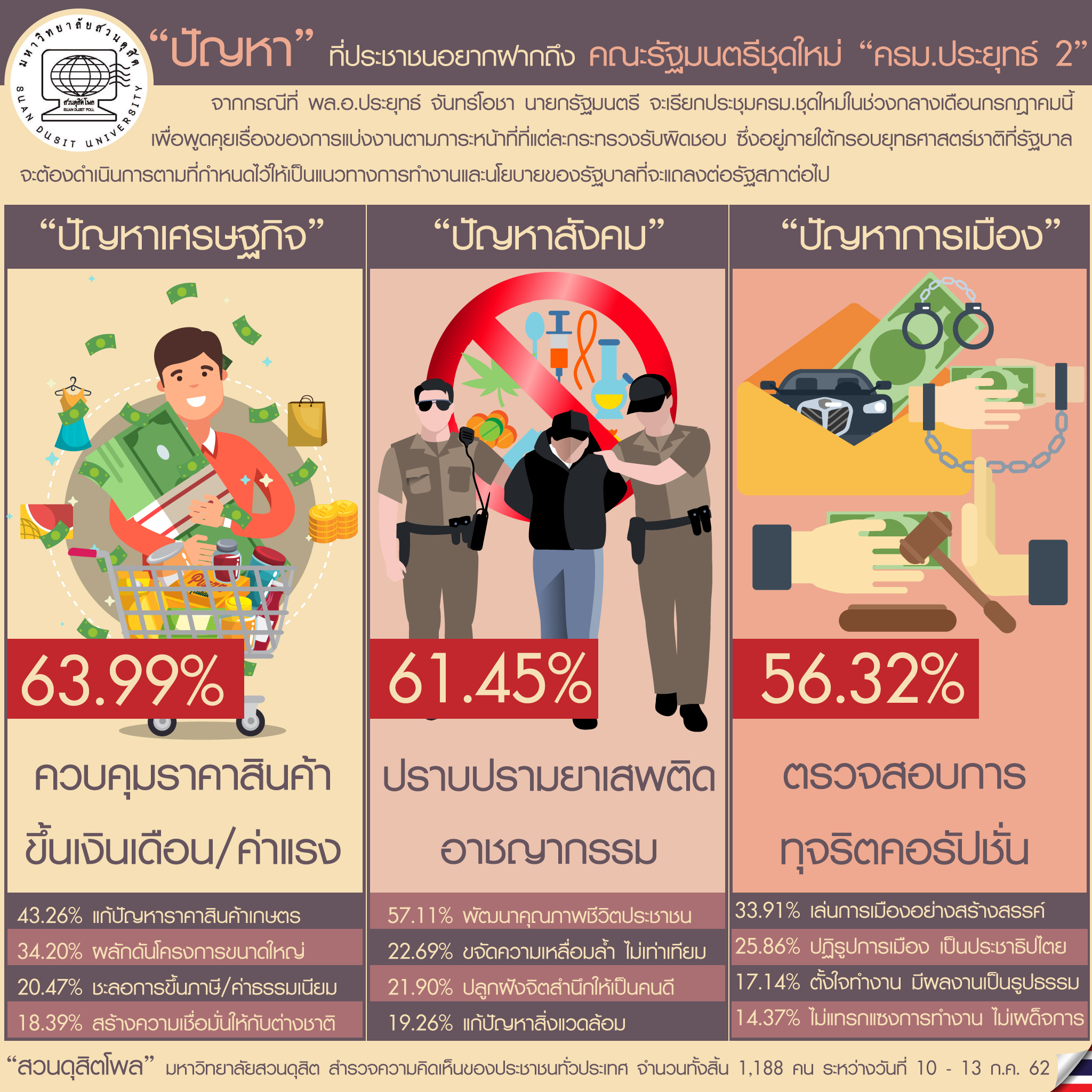 จากสถานการณ์การเมืองหลังการแต่งตั้งคณะรัฐมนตรีชุดใหม่ รัฐบาลกำลังเตรียมจัดประชุมเพื่อแบ่งงานตามยุทธศาสตร์ชาติ เพื่อสะท้อนความคาดหวังของประชาชน จำนวน 1,188 คน ได้แสดงความเห็นระหว่างวันที่ 10–13 กรกฎาคม 2562 โดยพบว่า ประเด็นทางเศรษฐกิจที่ประชาชนอยากให้เร่งดำเนินการมากที่สุด คือ การควบคุมราคาสินค้าและเพิ่มรายได้ เช่น ขึ้นเงินเดือนและค่าแรง (63.99%) ตามด้วยการแก้ปัญหาราคาสินค้าเกษตรและส่งออก (43.26%) สำหรับด้านสังคม ประชาชนต้องการให้เน้นการปราบปรามยาเสพติดและอาชญากรรม (61.45%) และพัฒนาคุณภาพชีวิตประชาชน (57.11%) ในด้านการเมือง ประเด็นสำคัญที่สุดคือ การตรวจสอบการทุจริตคอร์รัปชันในโครงการภาครัฐ (56.32%) และส่งเสริมการเมืองสร้างสรรค์ที่ไม่ใช้ความขัดแย้งเป็นเครื่องมือ (33.91%) ข้อเสนอเหล่านี้สะท้อนถึงความคาดหวังของประชาชนที่ต้องการเห็นรัฐบาลบริหารประเทศด้วยความโปร่งใส ยึดหลักประชาธิปไตย และตอบสนองต่อปัญหาปากท้องอย่างแท้จริง