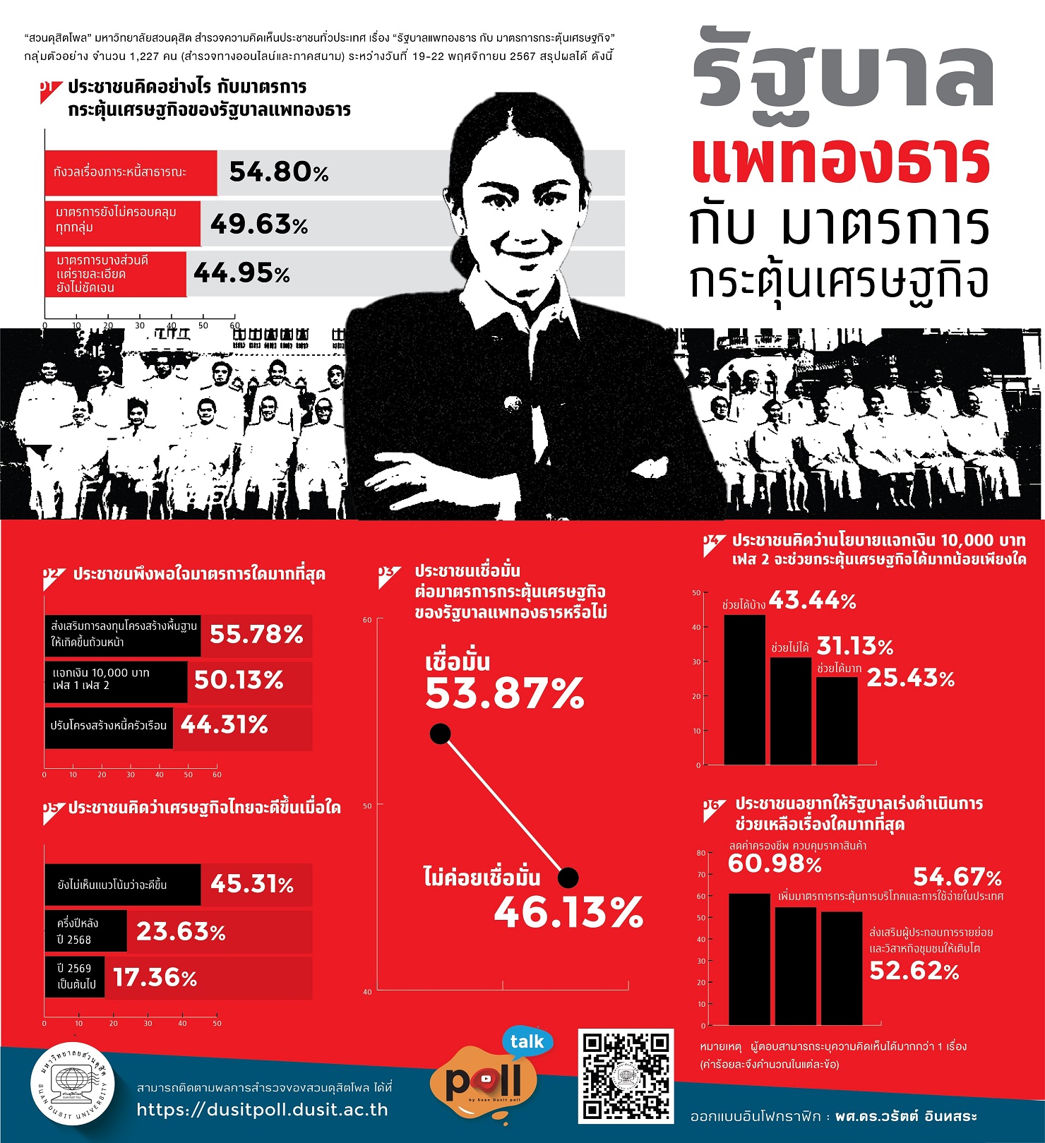 สวนดุสิตโพล มหาวิทยาลัยสวนดุสิต สำรวจความคิดเห็นประชาชนทั่วประเทศ เรื่อง “รัฐบาลแพทองธาร กับ มาตรการกระตุ้นเศรษฐกิจ” ระหว่างวันที่ 19-22 พฤศจิกายน 2567 กลุ่มตัวอย่างจำนวน 1,227 คน สำรวจทางออนไลน์และภาคสนาม พบว่า กลุ่มตัวอย่างกังวลว่ามาตรการกระตุ้นเศรษฐกิจของรัฐบาลแพทองธารอาจก่อให้เกิดภาระหนี้สาธารณะร้อยละ 54.80 ซึ่งจากมาตรการต่าง ๆ ผู้ตอบแบบสอบถามพึงพอใจมาตรการส่งเสริมการลงทุนโครงสร้างพื้นฐานให้เกิดขึ้นถ้วนหน้ามากที่สุดร้อยละ 55.78 และเชื่อมั่นต่อมาตรการกระตุ้นเศรษฐกิจของรัฐบาล ร้อยละ 53.87 โดยคิดว่านโยบายแจกเงิน 10,000 บาท เฟส 2 อาจจะช่วยกระตุ้นเศรษฐกิจได้บ้าง ร้อยละ 43.44 แต่ยังไม่เห็นแนวโน้มว่าเศรษฐกิจไทยจะดีขึ้น ร้อยละ 45.31 ทั้งนี้อยากให้รัฐบาลช่วยเหลือเรื่องลดค่าครองชีพ ควบคุมราคาสินค้ามากที่สุด ร้อยละ 60.98 นางสาวพรพรรณ บัวทอง ประธานสวนดุสิตโพล ระบุว่า จากผลสำรวจสะท้อนความเห็นที่แตกต่างกันในสังคมต่อมาตรการกระตุ้นเศรษฐกิจ แม้จะเชื่อมั่นแต่ก็ยังไม่แน่ใจในนโยบายเฉพาะหน้า และมีความกังวลต่อความมั่นคงทางการเงินของประเทศ ด้านมุมมองต่อสัญญาณฟื้นตัวของเศรษฐกิจก็ยังไม่เห็นแนวโน้มว่าจะดีขึ้นในอนาคตอันใกล้ เรียกว่า “ชอบเงินหมื่นแต่ไม่รู้เศรษฐกิจจะฟื้นเมื่อไหร่” ทั้งนี้ ต้องการให้แก้ปัญหาเฉพาะหน้าอย่างเรื่องปากท้องโดยเร่งด่วน