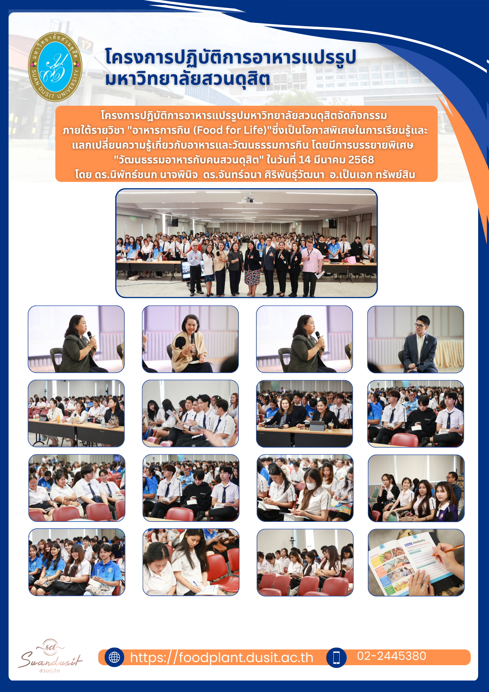 โครงการปฎิบัติการอาหารแปรรูป มหาวิทยาลัยสวนดุสิต ได้จัดกิจกรรมบรรยายพิเศษภายใต้รายวิชา "อาหารการกิน (Food for Life)"