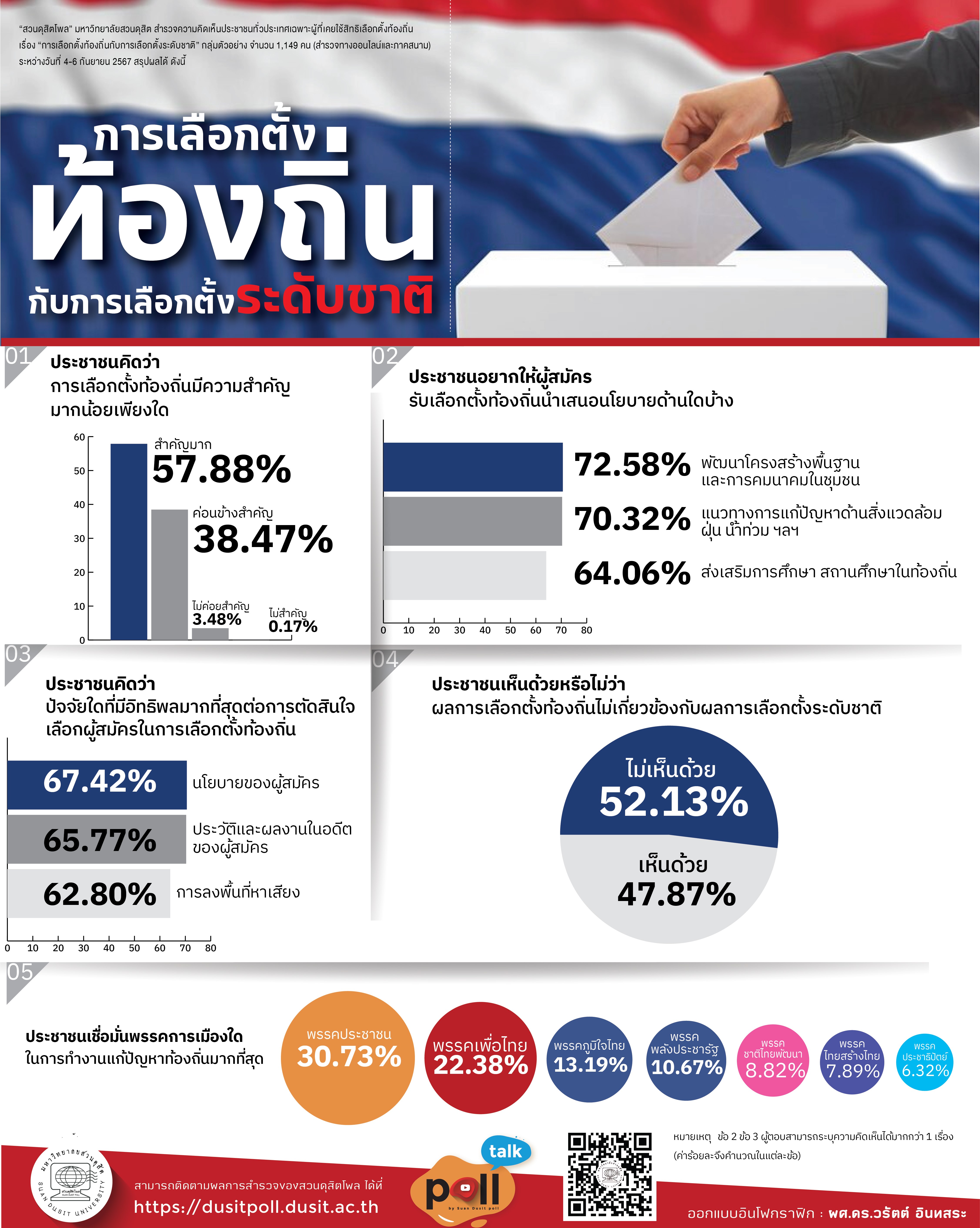 สวนดุสิตโพล มหาวิทยาลัยสวนดุสิต สำรวจความคิดเห็นประชาชนทั่วประเทศเฉพาะผู้ที่เคยไปใช้สิทธิเลือกตั้งท้องถิ่น เรื่อง “การเลือกตั้งท้องถิ่นกับการเลือกตั้งระดับชาติ” ระหว่างวันที่ 4-6 กันยายน 2567 กลุ่มตัวอย่างจำนวน 1,149 คน สำรวจผ่านทางออนไลน์และภาคสนาม พบว่า กลุ่มตัวอย่างคิดว่าการเลือกตั้งท้องถิ่นมีความสำคัญมาก ร้อยละ 57.88 โดยอยากให้ผู้สมัครนำเสนอนโยบายด้านการพัฒนาโครงสร้างพื้นฐานและการคมนาคมในชุมชน ร้อยละ 72.58 ปัจจัยที่มีอิทธิพลต่อการตัดสินใจเลือกผู้สมัคร คือ นโยบายของผู้สมัคร ร้อยละ 67.42 ทั้งนี้ไม่เห็นด้วยหากมองว่าผลการเลือกตั้งท้องถิ่นไม่เกี่ยวข้องกับผลการเลือกตั้งระดับชาติ ร้อยละ 52.13 สุดท้ายในการทำงานท้องถิ่นมีความเชื่อมั่นในพรรคประชาชนมากที่สุด ร้อยละ 30.73 รองลงมาคือ เพื่อไทย ร้อยละ 22.38 เมื่อนำมาเปรียบเทียบกับผลการสำรวจเมื่อวันที่ 9 - 12 กรกฎาคม 2567 พบว่า คะแนนของพรรคประชาชน (ก้าวไกลเดิม) ลดลงเล็กน้อย จากร้อยละ 32.53 เหลือร้อยละ 30.73 ในขณะที่พรรค เพื่อไทยเพิ่มขึ้นจากร้อยละ 19.79 เป็นร้อยละ 22.38