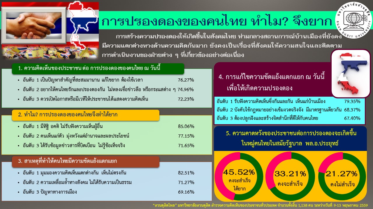 การสร้างความปรองดองในสังคมไทยยังคงเป็นประเด็นที่ได้รับความสนใจจากประชาชน เนื่องจากสถานการณ์บ้านเมืองที่มีความเห็นต่างอย่างต่อเนื่อง “สวนดุสิตโพล” ได้ทำการสำรวจความคิดเห็นของประชาชนทั่วประเทศ จำนวน 1,138 คน ระหว่างวันที่ 9–13 พฤษภาคม 2559 พบว่า คนไทยมองว่าการปรองดองเป็นปัญหาที่สะสมมานาน ต้องใช้เวลาในการแก้ไข โดยปัจจัยสำคัญที่ทำให้การปรองดองยาก ได้แก่ ความมีทิฐิ อคติ ไม่รับฟังผู้อื่น การเห็นแก่ตัว การเลือกข้าง และการไม่เชื่อมั่นในระบบกฎหมาย ขณะที่สาเหตุของความขัดแย้งเกิดจากความเห็นต่าง ความเหลื่อมล้ำทางสังคม ปัญหาการเมือง และความแตกต่างทางฐานะและการศึกษา แนวทางการแก้ไขที่ประชาชนเสนอคือ การเปิดใจรับฟัง ลดทิฐิ บังคับใช้กฎหมายอย่างเป็นธรรม และส่งเสริมกิจกรรมสร้างความปรองดอง ประชาชนส่วนใหญ่มองว่าการปรองดองยังคงเป็นเรื่องยากที่จะสำเร็จในยุครัฐบาล พล.อ.ประยุทธ์ จันทร์โอชา เนื่องจากความขัดแย้งยังคงดำรงอยู่และยากต่อการเปลี่ยนแปลงทัศนคติของแต่ละฝ่าย