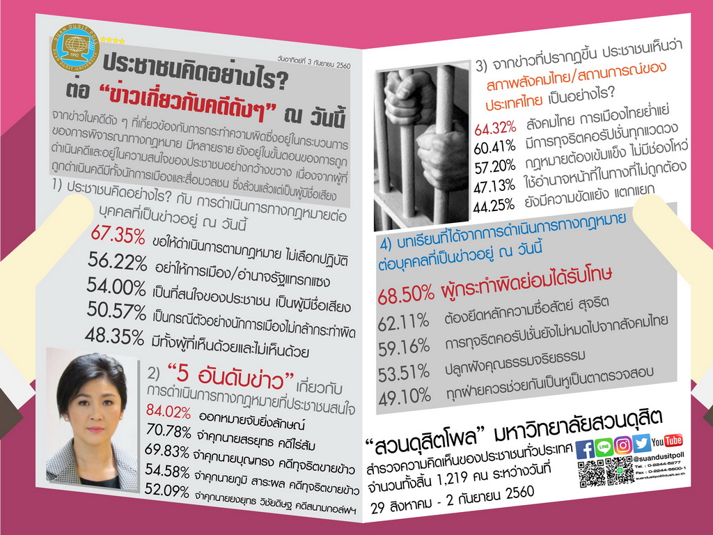 การสำรวจความคิดเห็นของประชาชนจำนวน 1,219 คน ระหว่างวันที่ 29 สิงหาคม - 2 กันยายน 2560 เกี่ยวกับการรับรู้และทัศนคติต่อข่าวคดีดังในช่วงดังกล่าว พบประเด็นสำคัญหลายมิติ ในด้านการรับรู้ข่าวคดีต่างๆ ประชาชนส่วนใหญ่ (67.35%) เห็นว่าประชาชนติดตามข่าวคดีอย่างใกล้ชิด และมีความสนใจในกระบวนการทางกฎหมาย ขณะที่ 56.22% ชี้ให้เห็นว่าการเมือง/อำนาจรัฐมีกระทบกระเทือนต่อความเป็นธรรมสำหรับ "5 อันดับข่าว" ที่ได้รับความสนใจสูงสุด คือ การออกหมายจับยิ่งลักษณ์ (84.02%) จากคดีข้าว รองลงมาคือคดีของนายบุญทรง (70.78%) นายภูมิ สาระผล (69.83%) นายยงยุทธ วิชัยดิษฐ (54.58%) และนายสรยุทธ (52.09%) เมื่อถามถึงผลกระทบต่อการเมืองไทย ประชาชนส่วนใหญ่ (64.32%) เชื่อว่าลักษณะการเมืองไทยจะเปลี่ยนแปลง 60.41% มองว่าการเมืองจะมีความขัดแย้งน้อยลง และ 57.20% คิดว่าภาพลักษณ์การเมืองไทยจะดีขึ้น ประเด็นการปฏิรูปที่ได้รับความสนใจสูงสุดคือ การปฏิรูปกฎหมาย (68.50%) เพื่อให้ผู้กระทำผิดต้องได้รับโทษที่เหมาะสม ตามด้วยการต้องยึดหลักความเหลื่อมล้ำและลดจำนวนคดีล้มเหลว