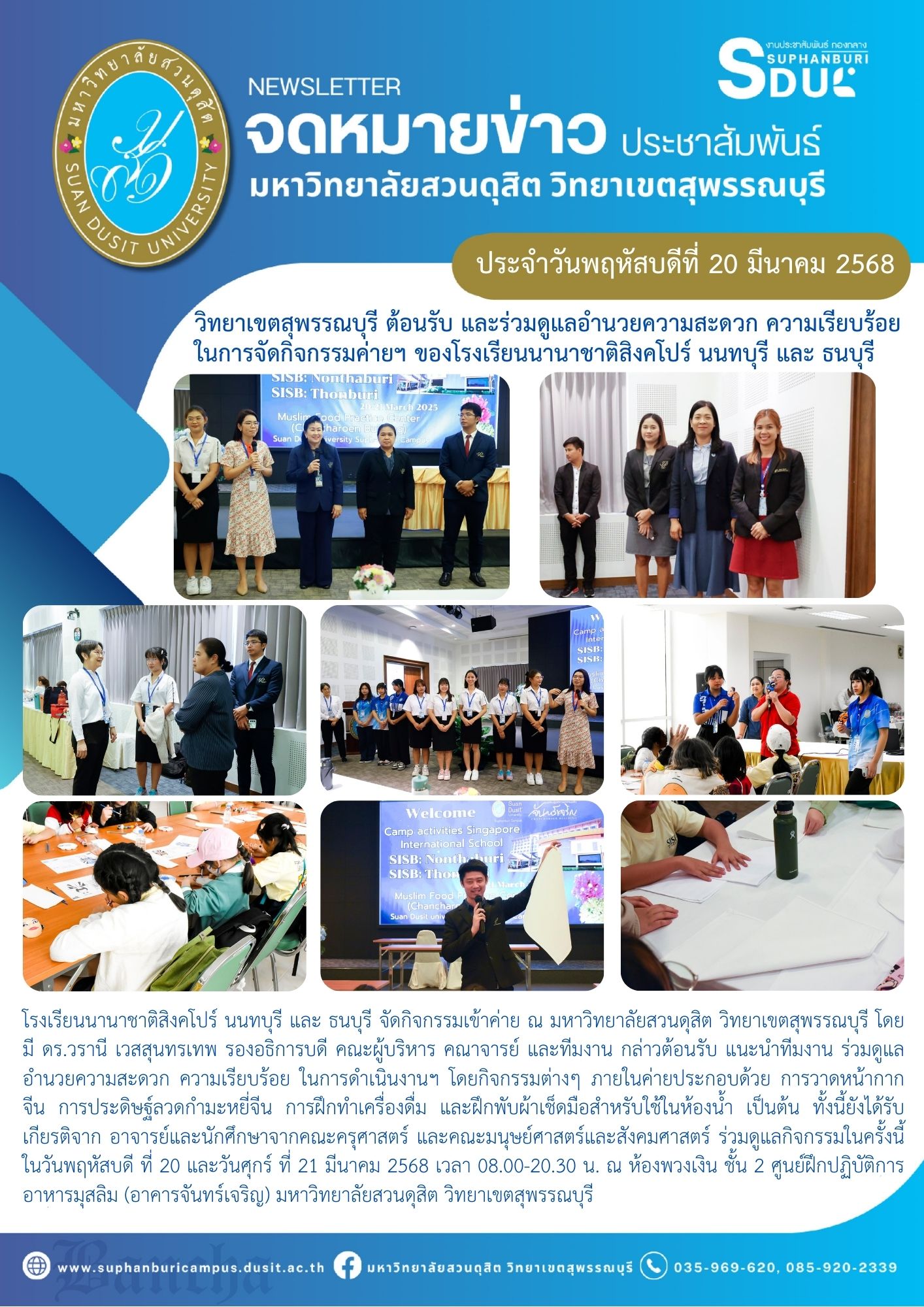 โรงเรียนนานาชาติสิงคโปร์ นนทบุรี และ ธนบุรี จัดกิจกรรมเข้าค่าย ณ มหาวิทยาลัยสวนดุสิต วิทยาเขตสุพรรณบุรี โดยมี ดร.วรานี เวสสุนทรเทพ รองอธิการบดี คณะผู้บริหาร คณาจารย์ และทีมงาน กล่าวต้อนรับ แนะนำทีมงาน ร่วมดูแลอำนวยความสะดวก ความเรียบร้อย ในการดำเนินงานฯ โดยกิจกรรมต่างๆ ภายในค่ายประกอบด้วย การวาดหน้ากากจีน การประดิษฐ์ลวดกำมะหยี่จีน การฝึกทำเครื่องดื่ม และฝึกพับผ้าเช็ดมือสำหรับใช้ในห้องน้ำ เป็นต้น ทั้งนี้ยังได้รับเกียรติจาก อาจารย์และนักศึกษาจากคณะครุศาสตร์ และคณะมนุษย์ศาสตร์และสังคมศาสตร์ ร่วมดูแลกิจกรรมในครั้งนี้ ในวันพฤหัสบดีที่ 20 และวันศุกร์ที่ 21 มีนาคม 2568 เวลา 08.00-20.30 น. ณ ห้องพวงเงิน ชั้น 2 ศูนย์ฝึกปฏิบัติการอาหารมุสลิม (อาคารจันทร์เจริญ) มหาวิทยาลัยสวนดุสิต วิทยาเขตสุพรรณบุรี