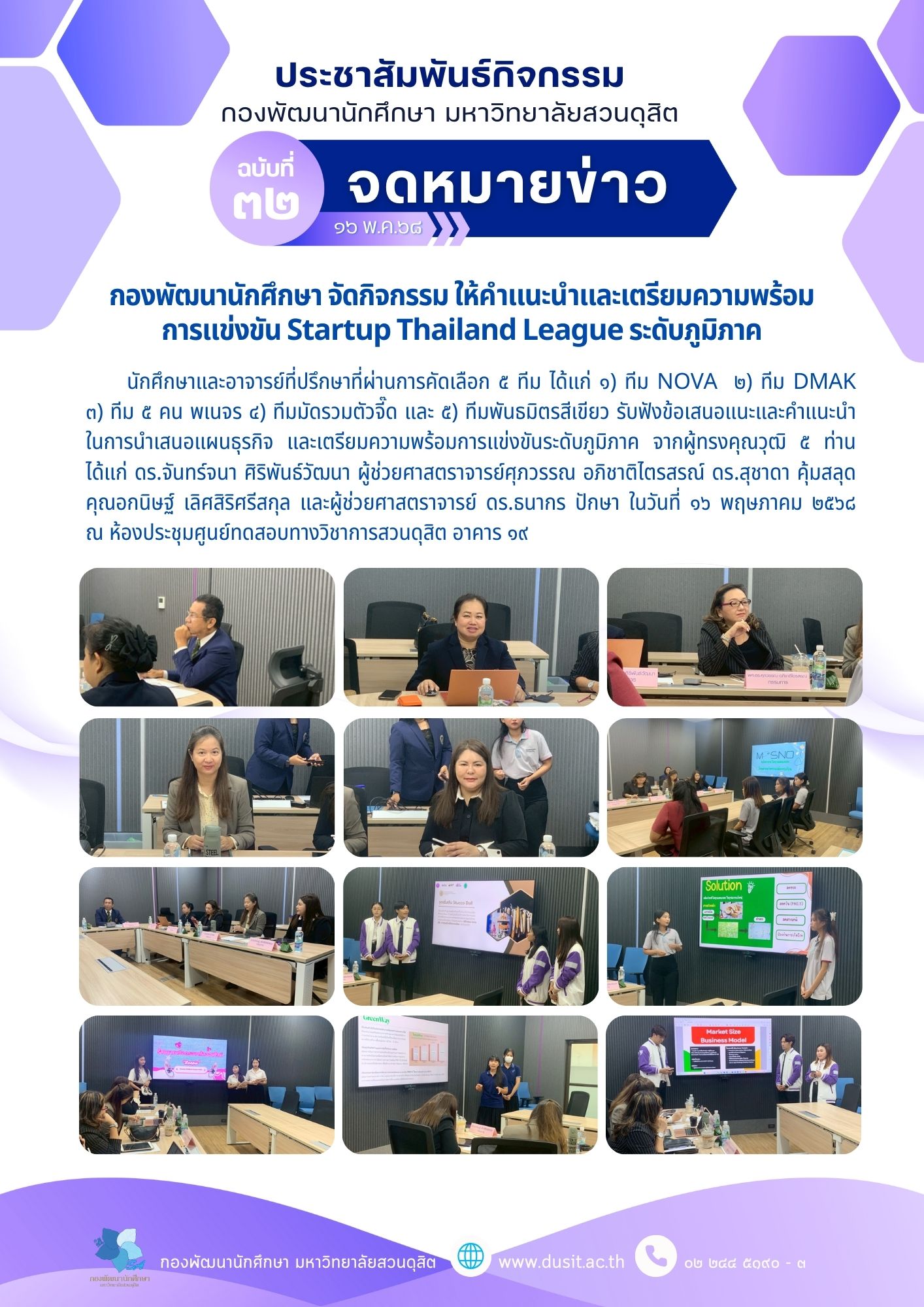นักศึกษาและอาจารย์ที่ปรึกษาที่ผ่านการคัดเลือก ๕ ทีม ได้แก่ ๑) ทีม NOVA ๒) ทีม DMAK ๓) ทีม ๕ คน พเนจร ๔) ทีมมัดรวมตัวจี๊ด และ ๕) ทีมพันธมิตรสีเขียว รับฟังข้อเสนอแนะและคำแนะนำในการนำเสนอแผนธุรกิจ และเตรียมความพร้อมการแข่งขันระดับภูมิภาค จากผู้ทรงคุณวุฒิ ๕ ท่าน ได้แก่ ดร.จันทร์จนา ศิริพันธ์วัฒนา ผู้ช่วยศาสตราจารย์ศุภวรรณ อภิชาติไตรสรณ์ ดร.สุชาดา คุ้มสลุด คุณอกนิษฐ์ เลิศสิริศรีสกุล และผู้ช่วยศาสตราจารย์ ดร.ธนากร ปักษา ในวันที่ ๑๖ พฤษภาคม ๒๕๖๘ ณ ห้องประชุมศูนย์ทดสอบทางวิชาการสวนดุสิต อาคาร ๑๙