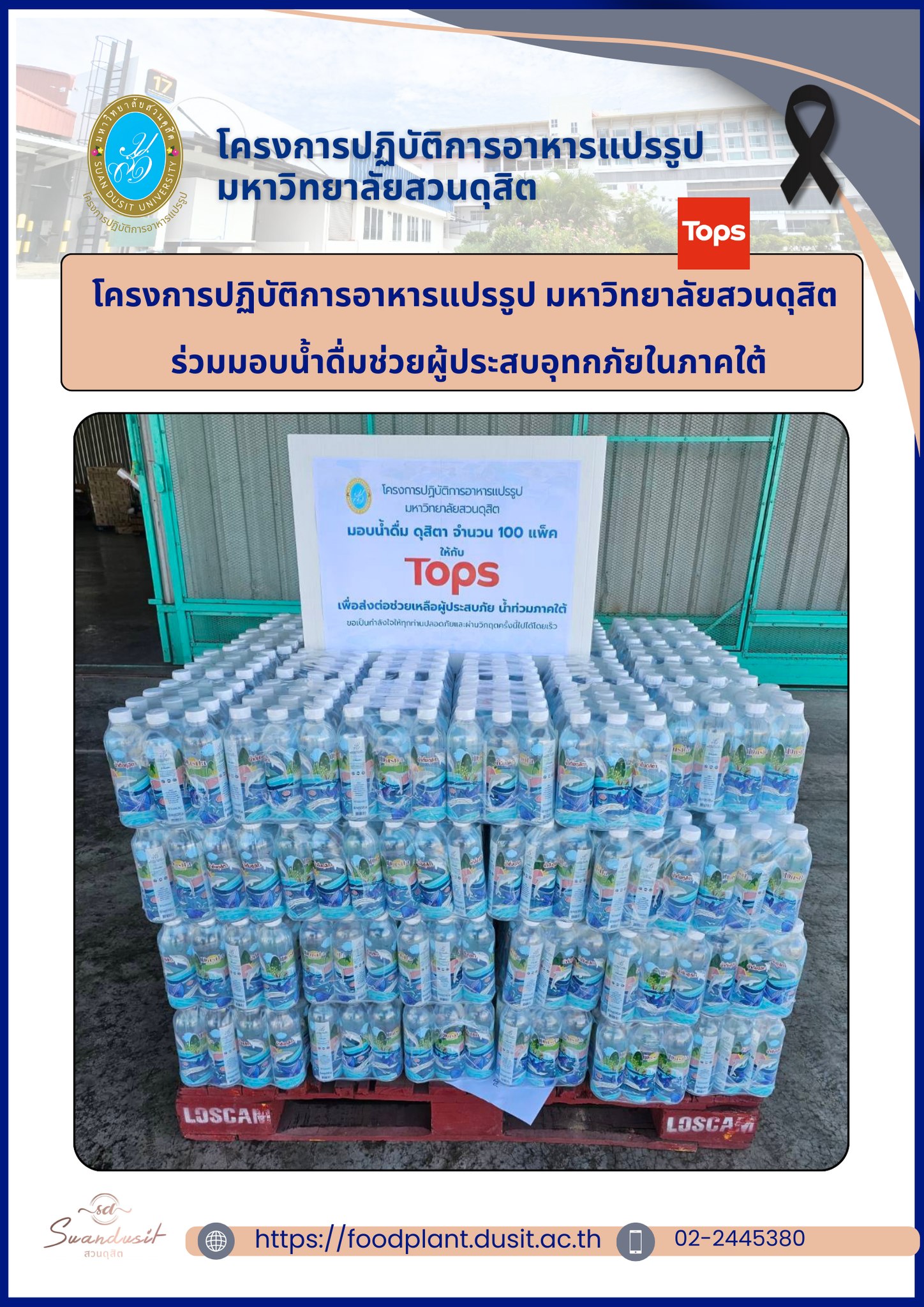 เมื่อวันที่ 2 ธันวาคม 2568 โครงการปฏิบัติการอาหารแปรรูป มหาวิทยาลัยสวนดุสิต ได้มอบน้ำดื่มจำนวน 100 แพ็ค ให้กับ Tops (บริษัท เซ็นทรัล ฟู้ด รีเทล จำกัด)