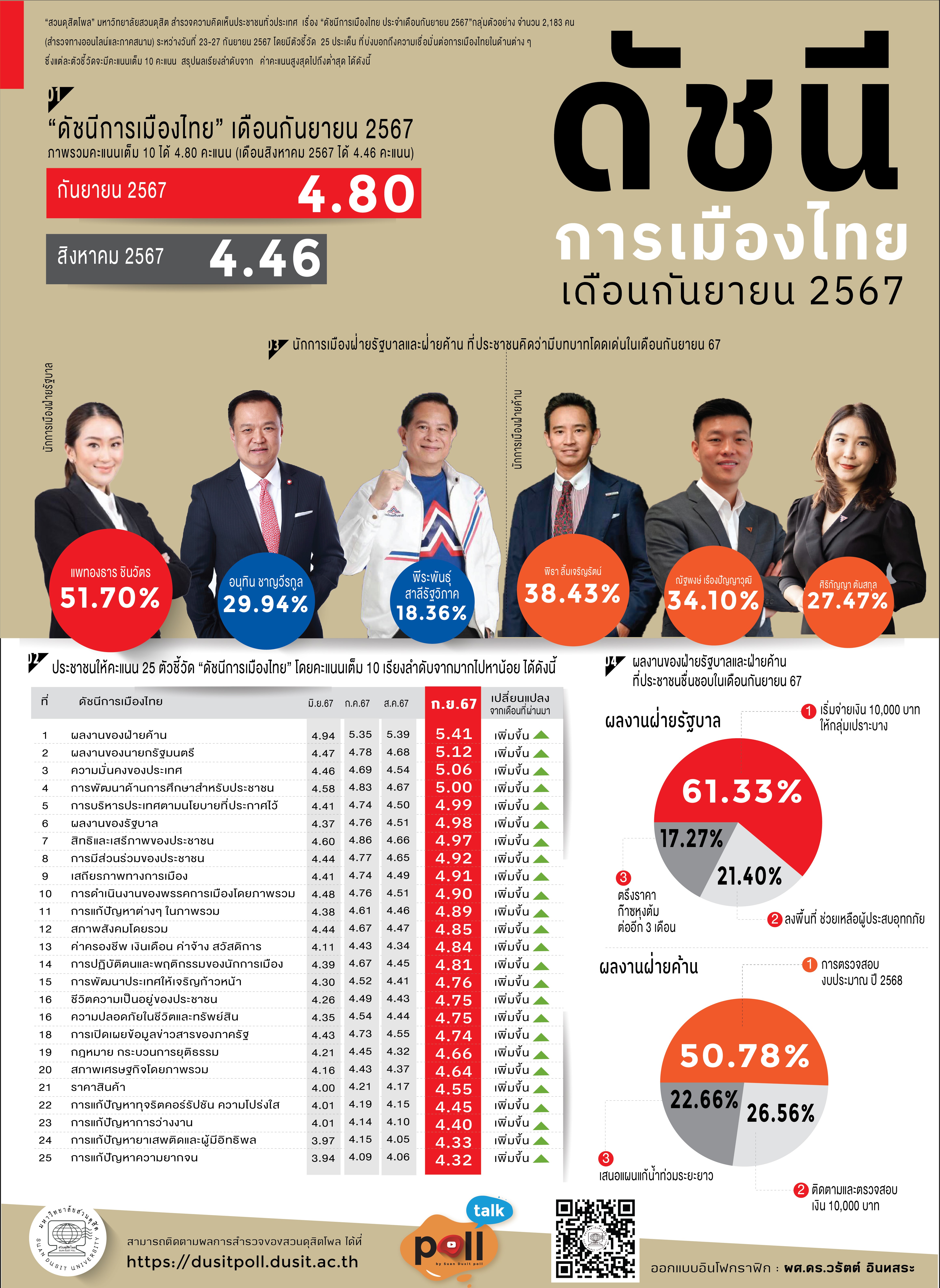 ตัวชี้วัดที่ได้คะแนนสูงสุด คือ ผลงานของฝ่ายค้าน เฉลี่ย 5.41 คะแนน (เพิ่มขึ้นจากเดือนสิงหาคม) ตัวชี้วัดที่ได้คะแนนต่ำสุด คือ การแก้ปัญหาความยากจน เฉลี่ย 4.32 คะแนน นักการเมืองฝ่ายรัฐบาลที่มีบทบาทโดดเด่นประจำเดือน คือ แพทองธาร ชินวัตร ร้อยละ 51.70 รองลงมาคือ อนุทิน ชาญวีรกูล ร้อยละ 29.94 ด้านนักการเมืองฝ่ายค้านที่มีบทบาทโดดเด่นประจำเดือน คือ พิธา ลิ้มเจริญรัตน์ ร้อยละ 38.43 รองลงมา คือ ณัฐพงษ์ เรืองปัญญาวุฒิ ร้อยละ 34.10 ผลงานฝ่ายรัฐบาล ที่ชื่นชอบประจำเดือน คือ เริ่มจ่ายเงิน 10,000 บาท ให้กลุ่มเปราะบาง ร้อยละ 61.33 ผลงานฝ่ายค้านที่ชื่นชอบประจำเดือน คือ ตรวจสอบงบประมาณ ปี 2568 ร้อยละ 50.78