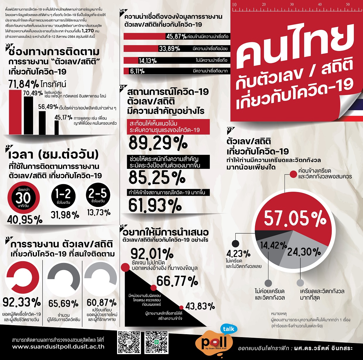 ในช่วงการแพร่ระบาดของโควิด-19 ข้อมูลตัวเลขและสถิติเกี่ยวกับผู้ติดเชื้อ ผู้เสียชีวิต และการฉีดวัคซีน กลายเป็นองค์ประกอบสำคัญที่ประชาชนใช้ในการประเมินสถานการณ์ สวนดุสิตโพล มหาวิทยาลัยสวนดุสิต ได้สำรวจความคิดเห็นของประชาชนจำนวน 1,270 คน ระหว่างวันที่ 9–12 สิงหาคม 2564 พบว่า ประชาชนติดตามตัวเลขและสถิติผ่านโทรทัศน์ (ร้อยละ 71.84) และโซเชียลมีเดีย (ร้อยละ 70.49) เป็นหลัก โดยใช้เวลาน้อยกว่า 30 นาทีต่อวัน เรื่องที่ประชาชนสนใจมากที่สุดคือยอดผู้ติดเชื้อและผู้เสียชีวิตรายวัน (ร้อยละ 92.33) ทั้งนี้ประชาชนส่วนใหญ่เห็นว่าข้อมูลเหล่านี้มีความสำคัญเพราะช่วยให้เข้าใจสถานการณ์ ตระหนักรู้ และสามารถวางแผนการดำเนินชีวิตได้ อย่างไรก็ตาม ร้อยละ 57.05 ระบุว่าข้อมูลตัวเลขทำให้เกิดความเครียดพอสมควร และต้องการให้ภาครัฐนำเสนอข้อมูลอย่างชัดเจน มีแหล่งอ้างอิงและสามารถตรวจสอบได้ เพื่อเสริมสร้างความเชื่อมั่นของสังคมในภาวะวิกฤติ การสื่อสารข้อมูลที่โปร่งใสจึงเป็นภารกิจสำคัญของรัฐบาลในการรับมือกับโรคระบาดในระยะยาว