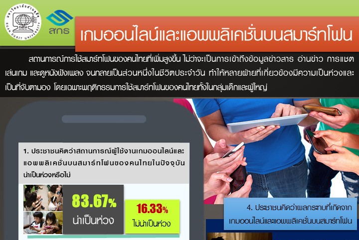 จากสถานการณ์การใช้สมาร์ทโฟนที่เพิ่มขึ้นอย่างรวดเร็วในสังคมไทย โดยเฉพาะในกลุ่มเด็กและเยาวชน สวนดุสิตโพลร่วมกับสำนักงานกิจการยุติธรรม ได้สำรวจความคิดเห็นของประชาชนในกรุงเทพฯ และปริมณฑล จำนวน 539 คน ระหว่างวันที่ 24–28 สิงหาคม 2559 เพื่อศึกษาผลกระทบและแนวทางการจัดระเบียบเกมออนไลน์และแอปพลิเคชันบนสมาร์ทโฟน ผลสำรวจพบว่า ประชาชนส่วนใหญ่เห็นว่าสถานการณ์การใช้เกมและแอปในปัจจุบัน “น่าเป็นห่วง” โดยมีผลกระทบต่อการเรียน การทำงาน และการใช้ชีวิตประจำวัน ทั้งยังเสี่ยงต่อภัยจากมิจฉาชีพและการลอกเลียนพฤติกรรมรุนแรง ผู้ตอบแบบสอบถามส่วนใหญ่มองว่าการควบคุมของภาครัฐยังไม่เหมาะสมเพียงพอ และควรมีการจัดระเบียบและบังคับใช้กฎหมายอย่างจริงจัง โดยเฉพาะในประเด็นเกมยอดนิยมอย่าง “โปเกมอน โก” ที่อาจละเมิดกฎหมายจราจรและสิทธิส่วนบุคคล ความเห็นเหล่านี้จึงเป็นข้อมูลสำคัญสำหรับการออกนโยบายและกฎหมายที่สมดุลระหว่างการใช้เทคโนโลยีกับการคุ้มครองสังคม
