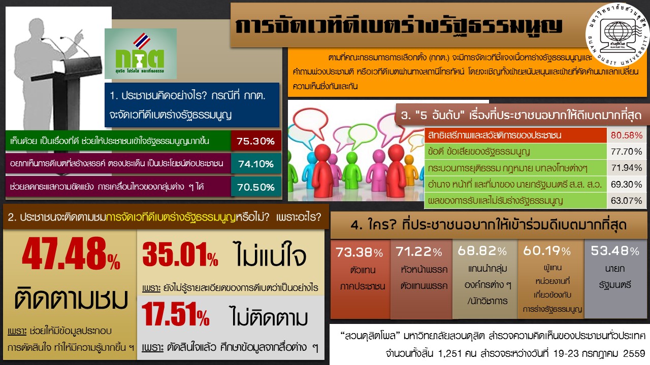 เพื่อตอบสนองต่อความสนใจของสังคมในการทำประชามติร่างรัฐธรรมนูญ คณะกรรมการการเลือกตั้ง (กกต.) ได้เตรียมจัดเวทีดีเบตผ่านสถานีโทรทัศน์ เพื่อให้ประชาชนได้รับข้อมูลที่รอบด้าน “สวนดุสิตโพล” ได้สำรวจความคิดเห็นของประชาชน 1,251 คน ระหว่างวันที่ 19–23 กรกฎาคม 2559 พบว่าประชาชนส่วนใหญ่เห็นด้วยกับการจัดเวทีดีเบต โดยมองว่าเป็นแนวทางที่ดีในการส่งเสริมความเข้าใจ ลดความขัดแย้ง และส่งเสริมระบอบประชาธิปไตย ประชาชนร้อยละ 47.48 ตั้งใจจะติดตามเวทีดีเบต โดยเฉพาะในประเด็นสิทธิเสรีภาพ ข้อดีข้อเสียของรัฐธรรมนูญ และบทบาทของฝ่ายนิติบัญญัติและบริหาร นอกจากนี้ยังต้องการให้มีผู้ร่วมเวทีที่หลากหลาย เช่น ตัวแทนภาคประชาชน หัวหน้าพรรคการเมือง นักวิชาการ และหน่วยงานที่เกี่ยวข้อง สะท้อนให้เห็นถึงความคาดหวังของประชาชนต่อกระบวนการสื่อสารทางการเมืองที่เปิดกว้างและสร้างสรรค์ เพื่อประกอบการตัดสินใจในการลงประชามติอย่างรอบคอบ