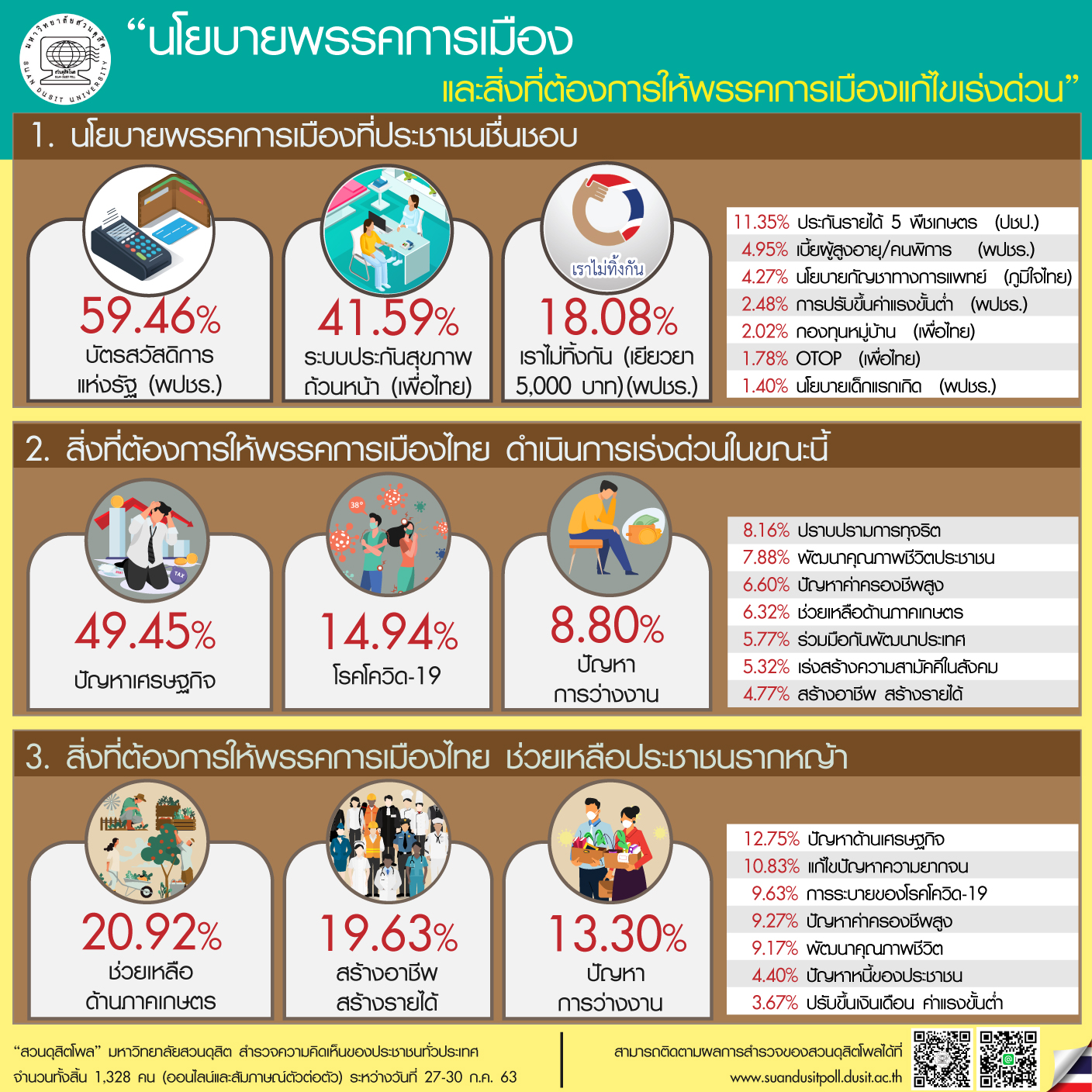 สวนดุสิตโพล มหาวิทยาลัยสวนดุสิต ได้ทำการสำรวจความคิดเห็นของประชาชนจำนวน 1,328 คน ระหว่างวันที่ 27–30 กรกฎาคม 2563 เพื่อสะท้อนมุมมองต่อ “นโยบายพรรคการเมือง” และสิ่งที่ประชาชนต้องการให้เร่งดำเนินการ พบว่า นโยบายที่ได้รับความชื่นชอบมากที่สุดคือบัตรสวัสดิการแห่งรัฐ (พรรคพลังประชารัฐ) รองลงมาคือระบบประกันสุขภาพถ้วนหน้า (พรรคเพื่อไทย) และโครงการเราไม่ทิ้งกัน ขณะเดียวกัน ปัญหาเร่งด่วนที่ประชาชนต้องการให้พรรคการเมืองแก้ไข ได้แก่ ปัญหาเศรษฐกิจ ว่างงาน ค่าครองชีพ และการแพร่ระบาดของโควิด-19 โดยเฉพาะกลุ่มรากหญ้า ประชาชนต้องการให้พรรคการเมืองให้ความสำคัญกับเกษตรกรรม การสร้างอาชีพที่ยั่งยืน และการแก้ปัญหาหนี้สิน สะท้อนให้เห็นถึงความคาดหวังที่มีต่อพรรคการเมืองในการขับเคลื่อนนโยบายที่ตอบโจทย์ชีวิตจริงของประชาชน