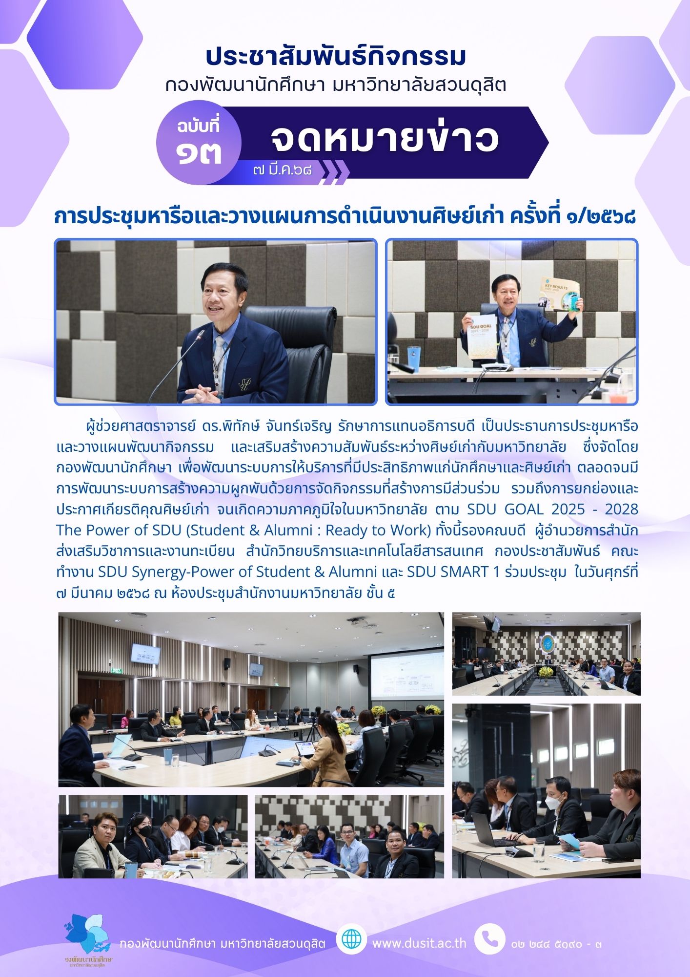 | dc.description.abstract | ผู้ช่วยศาสตราจารย์ ดร.พิทักษ์ จันทร์เจริญ รักษาการแทนอธิการบดี เป็นประธานการประชุมหารือและวางแผนพัฒนากิจกรรม และเสริมสร้างความสัมพันธ์ระหว่างศิษย์เก่ากับมหาวิทยาลัย ซึ่งจัดโดยกองพัฒนานักศึกษา เพื่อพัฒนาระบบการให้บริการที่มีประสิทธิภาพแก่นักศึกษาและศิษย์เก่า ตลอดจนมีการพัฒนาระบบการสร้างความผูกพันด้วยการจัดกิจกรรมที่สร้างการมีส่วนร่วม รวมถึงการยกย่องและประกาศเกียรติคุณศิษย์เก่า จนเกิดความภาคภูมิใจในมหาวิทยาลัย ตาม SDU GOAL 2025 - 2028 The Power of SDU (Student & Alumni : Ready to Work) ทั้งนี้รองคณบดี ผู้อำนวยการสำนักส่งเสริมวิชาการและงานทะเบียน สำนักวิทยบริการและเทคโนโลยีสารสนเทศ กองประชาสัมพันธ์ คณะทำงาน SDU Synergy-Power of Student & Alumni และ SDU SMART 1 ร่วมประชุม ในวันศุกร์ที่ ๗ มีนาคม ๒๕๖๘ ณ ห้องประชุมสำนักงานมหาวิทยาลัย ชั้น ๕ | |
