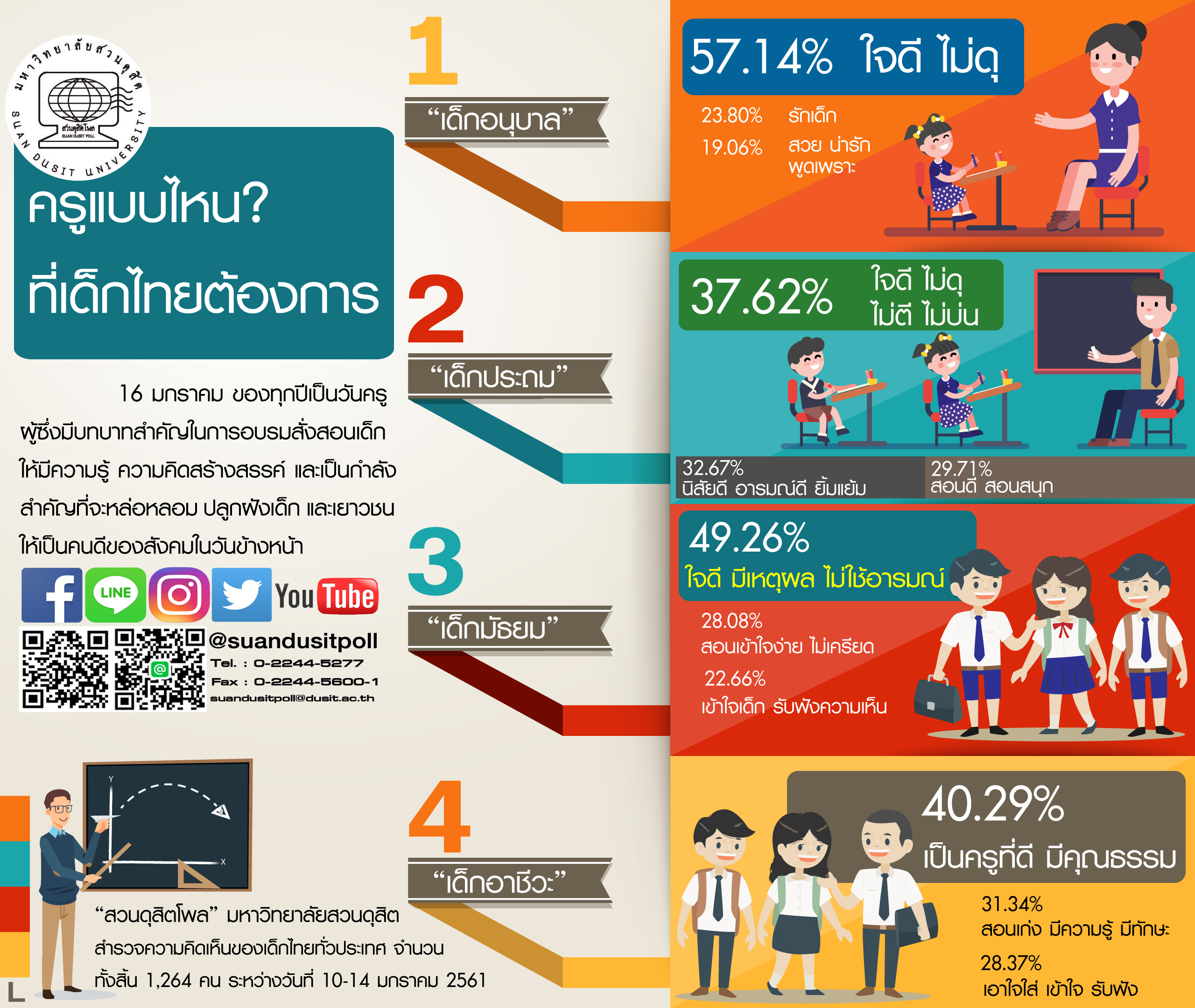 ในโอกาสวันครู 16 มกราคม 2561 “สวนดุสิตโพล” ได้สำรวจความคิดเห็นของเด็กไทยทั่วประเทศจำนวน 1,264 คน ระหว่างวันที่ 10-14 มกราคม 2561 ในหัวข้อ “ครูแบบไหน? ที่เด็กไทยต้องการ” เพื่อสะท้อนมุมมองของเด็กในแต่ละช่วงวัย ตั้งแต่ระดับอนุบาลถึงอาชีวศึกษา พบว่า เด็กอนุบาลต้องการครูที่ใจดี ไม่ดุ (57.14%) รักเด็ก และพูดเพราะ ส่วนเด็กประถมให้ความสำคัญกับครูที่ไม่ตี ไม่บ่น (37.62%) และสอนสนุก เด็กมัธยมเน้นครูที่มีเหตุผล ไม่ใช้อารมณ์ (49.26%) และเข้าใจเด็ก ขณะที่เด็กอาชีวะต้องการครูที่มีคุณธรรม (40.29%) สอนเก่ง และเข้าใจนักเรียน ผลการสำรวจนี้สะท้อนให้เห็นว่า เด็กไทยต้องการครูที่มีทั้งคุณธรรม ความสามารถ และทักษะในการสื่อสารเชิงบวก โดยมีแนวโน้มความต้องการครูที่เข้าใจและเคารพในตัวตนของนักเรียนมากขึ้นตามระดับวัย การศึกษานี้จึงเป็นข้อมูลสำคัญในการพัฒนาบุคลากรครูให้สอดรับกับความคาดหวังของเยาวชนไทยในอนาคต