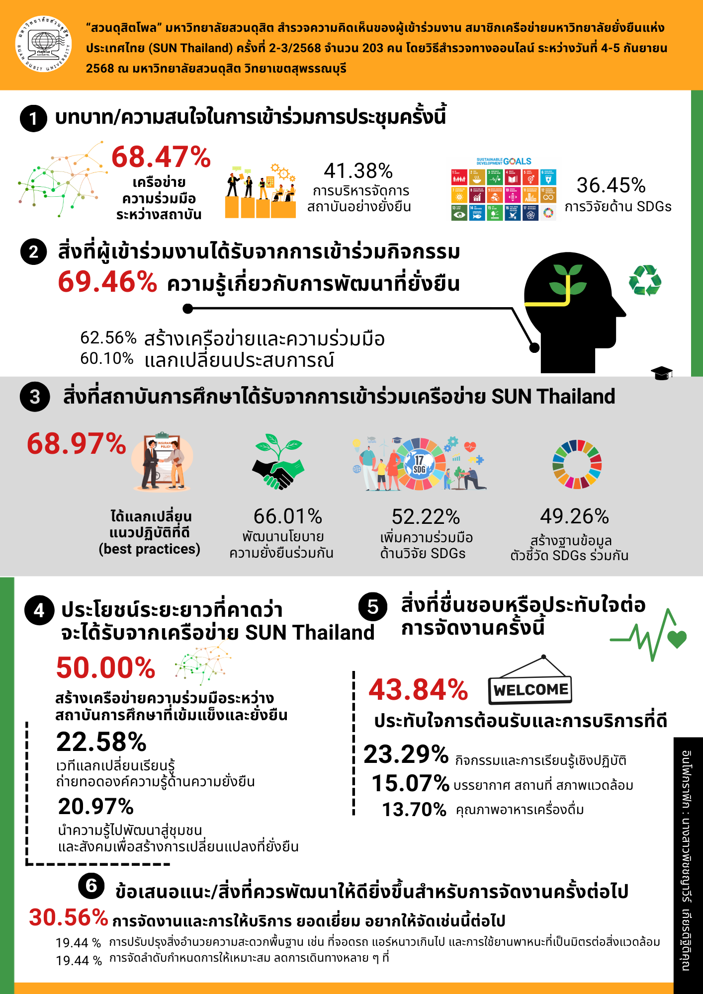 สวนดุสิตโพล มหาวิทยาลัยสวนดุสิต ได้สำรวจความคิดเห็นผู้เข้าร่วมประชุมเครือข่ายมหาวิทยาลัยยั่งยืนแห่งประเทศไทย (SUN Thailand) ครั้งที่ 2–3/2568 ณ วิทยาเขตสุพรรณบุรี ระหว่างวันที่ 4–5 กันยายน 2568 กลุ่มตัวอย่าง 203 คน ส่วนใหญ่เป็นเจ้าหน้าที่/บุคลากร (54.68%) และอาจารย์ (19.70%) ผลการสำรวจพบว่า ผู้เข้าร่วมให้ความสนใจหลักคือ การสร้างเครือข่ายและความร่วมมือระหว่างสถาบัน (68.47%) การบริหารจัดการสถาบันอย่างยั่งยืน (41.38%) และการวิจัยด้าน SDGs (36.45%)