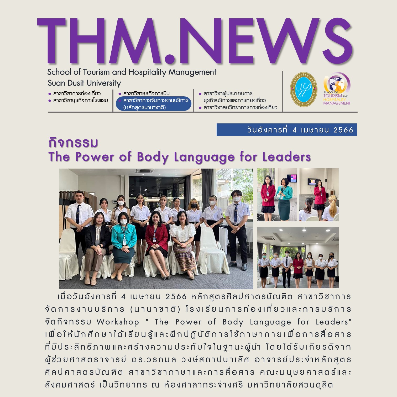 เมื่อวันอังคารที่ 4 เมษายน 2566 หลักสูตรศิลปศาตรบัณฑิต สาขาวิชาการจัดการงานบริการ (นานาชาติ) โรงเรียนการท่องเที่ยวและการบริการ จัดกิจกรรม Workshop " The Power of Body Language for Leaders" เพื่อให้นักศึกษาได้เรียนรู้และฝึกปฏิบัติการใช้ภาษากายเพื่อการสื่อสารที่มีประสิทธิภาพและสร้างความประทับใจในฐานะผู้นำ โดยได้รับเกียรติจากผู้ช่วยศาสตราจารย์ ดร.วรกมล วงษ์สถาปนาเลิศ อาจารย์ประจำหลักสูตรศิลปศาสตรบัณฑิต สาขาวิชาภาษาและการสื่อสาร คณะมนุษยศาสตร์และสังคมศาสตร์ เป็นวิทยากร ณ ห้องศาลากระจ่างศรี มหาวิทยาลัยสวนดุสิต