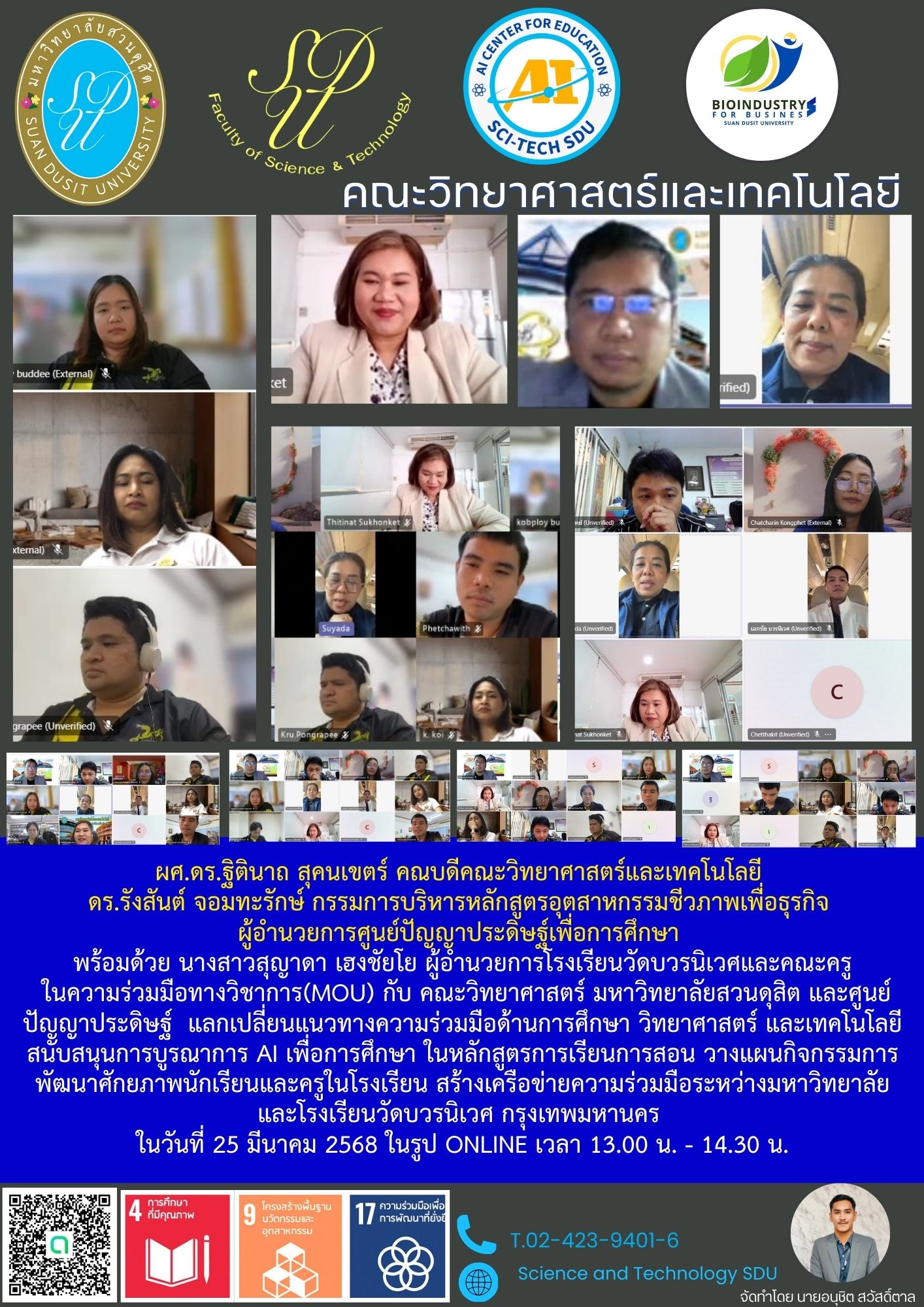 ในความร่วมมือทางวิชาการ(Mou) กับ คณะวิทยาศาสตร์ มหาวิทยาลัยสวนดุสิต และศูนย์ปัญญาประดิษฐ์ แลกเปลี่ยนแนวทางความร่วมมือด้านการศึกษา วิทยาศาสตร์ และเทคโนโลยีสนับสนุนการบูรณาการ AI เพื่อการศึกษา ในหลักสูตรการเรียนการสอน วางแผนกิจกรรมการพัฒนาศักยภาพนักเรียนและครูในโรงเรียน สร้างเครือข่ายความร่วมมือระหว่างมหาวิทยาลัย