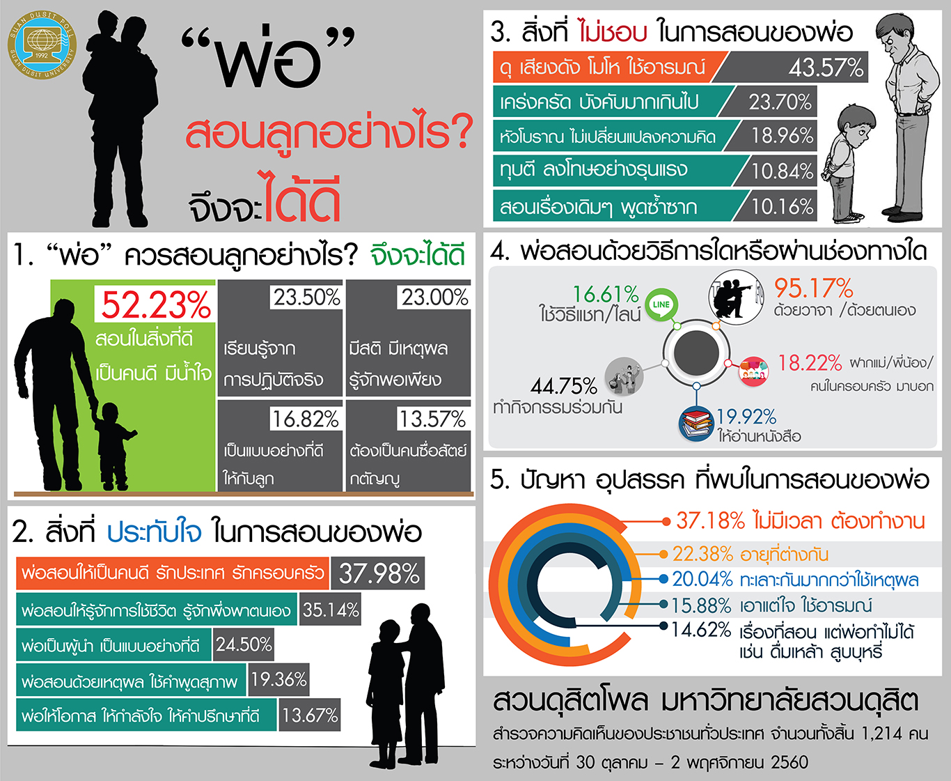 การสำรวจความคิดเห็นของประชาชนทั่วประเทศจำนวน 1,214 คน ระหว่างวันที่ 30 ตุลาคม – 2 พฤศจิกายน 2560 โดยสวนดุสิตโพล พบว่า 52.23% เห็นว่า “พ่อ” ควรสอนลูกโดยเน้นให้เป็นคนดี มีน้ำใจ ส่วน 23.5% เห็นว่าควรสอนให้รู้จักการปฏิบัติตัวจริง และ 23.0% เน้นเรื่องมีเหตุผล รู้จักพอเพียง สิ่งที่ประชาชนประทับใจมากที่สุดในการสอนของพ่อ คือ การปลูกฝังให้เป็นคนดี รักครอบครัวและประเทศชาติ (37.98%) รองลงมาคือ การสอนให้รู้จักการใช้ชีวิตด้วยตนเอง (35.14%) สิ่งที่ประชาชนไม่ชอบในการสอนของพ่อ คือ การดุด่าเสียงดัง (43.57%) ตามด้วยการใช้อารมณ์และความรุนแรง ส่วนวิธีการสอนที่พ่อใช้มากที่สุดคือการพูดด้วยตนเอง (95.17%) และการสอนจากประสบการณ์ตรง ผู้ตอบแบบสอบถามยังระบุว่าอุปสรรคสำคัญในการสอนลูกของพ่อ ได้แก่ การไม่มีเวลาเพราะต้องทำงาน (37.18%) และปัญหาเรื่องวัยที่ต่างกัน การสื่อสารไม่เข้าใจกัน หรือใช้อารมณ์มากกว่าเหตุผล