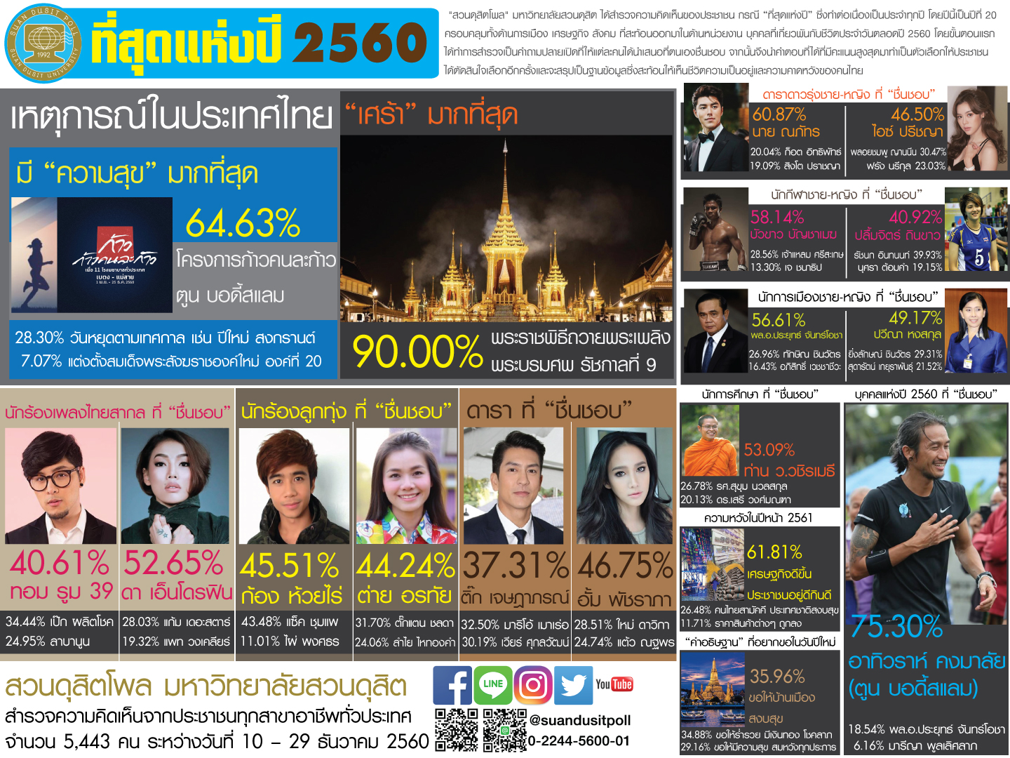 การสำรวจ "ที่สุดแห่งปี 2560" ของมหาวิทยาลัยสวนดุสิต ครั้งที่ 20 ระหว่างวันที่ 10-29 ธันวาคม 2560 จำนวน 5,443 คน ครอบคลุมทุกสาขาอาชีพทั่วประเทศ เพื่อสะท้อนชีวิตความเป็นอยู่และความคาดหวังของคนไทย โดยใช้วิธีการสำรวจคำถามปลายเปิดแล้วนำคำตอบที่ได้คะแนนสูงสุดมาเป็นตัวเลือก ผลการสำรวจพบว่า เหตุการณ์ที่สร้างความสุขมากที่สุดคือโครงการก้าวคนละก้าว ตูน บอดี้สแลม (64.63%) ส่วนเหตุการณ์ที่เศร้าที่สุดคือพระราชพิธีถวายพระเพลิงพระบรมศพ ร.9 (90.00%) สำหรับบุคคลที่ได้รับความนิยม ตูน บอดี้สแลมเป็นบุคคลแห่งปี (75.30%) รองลงมาคือ พล.อ.ประยุทธ์ จันทร์โอชา (18.54%) ในด้านความบันเทิง ดาราที่ได้รับความนิยมสูงสุดคือ ติ๊ก เจษฎาภรณ์ (37.31%) และอั้ม พัชราภา (46.75%) ความหวังในปี 2561 คือเศรษฐกิจดีขึ้นประชาชนอยู่ดีกินดี (61.81%) และคำอธิษฐานยอดนิยมคือขอให้บ้านเมืองสงบสุข (35.96%)