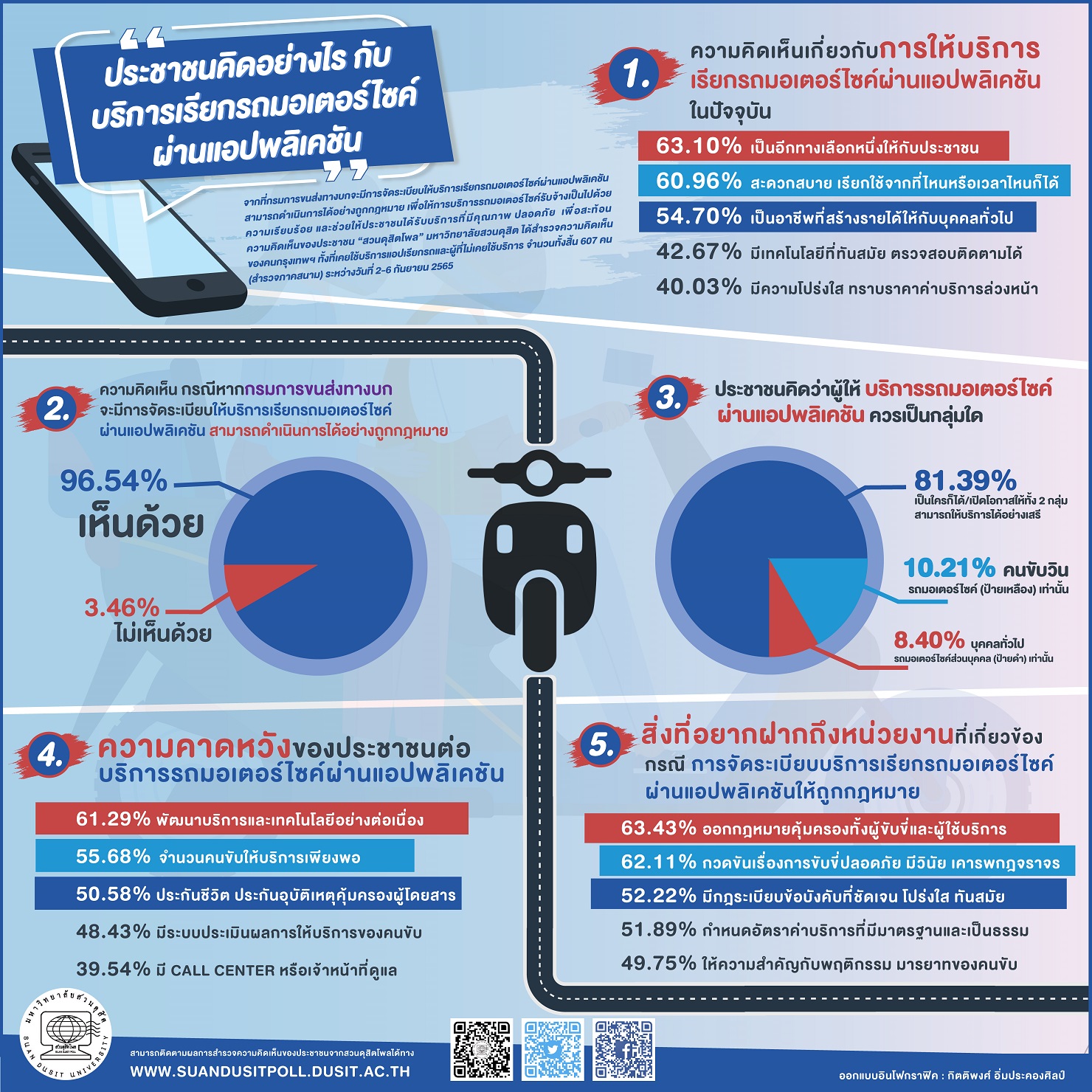 จากการสำรวจความคิดเห็นของประชาชนในเขตกรุงเทพฯ พบว่าการให้บริการเรียกรถมอเตอร์ไซค์ผ่านแอปพลิเคชันได้รับความนิยมเพิ่มขึ้น เนื่องจากความสะดวก รวดเร็ว และมีความโปร่งใสด้านค่าบริการ ร้อยละ 96.54 เห็นด้วยกับแนวทางของภาครัฐในการจัดระเบียบให้บริการนี้ให้ถูกกฎหมาย และร้อยละ 81.39 สนับสนุนให้เปิดโอกาสให้ทั้งผู้ขับขี่วินมอเตอร์ไซค์และบุคคลทั่วไปสามารถให้บริการได้อย่างเสรี ประชาชนคาดหวังให้มีการพัฒนาเทคโนโลยีบริการอย่างต่อเนื่อง มีจำนวนผู้ขับขี่เพียงพอ และมีระบบประกันภัยคุ้มครองผู้โดยสาร สิ่งสำคัญที่ฝากถึงหน่วยงานที่เกี่ยวข้องคือการออกกฎหมายคุ้มครองผู้ให้บริการและผู้โดยสาร ควบคุมมาตรฐานความปลอดภัย และกำหนดอัตราค่าบริการที่เป็นธรรม การสำรวจสะท้อนว่าแอปเรียกรถเป็นบริการที่ตอบโจทย์การเดินทางในเมืองใหญ่ และหากมีการจัดระเบียบที่ชัดเจนและเป็นธรรม จะช่วยยกระดับคุณภาพชีวิตของประชาชน รวมถึงสร้างโอกาสให้กับผู้ประกอบอาชีพได้อย่างยั่งยืน