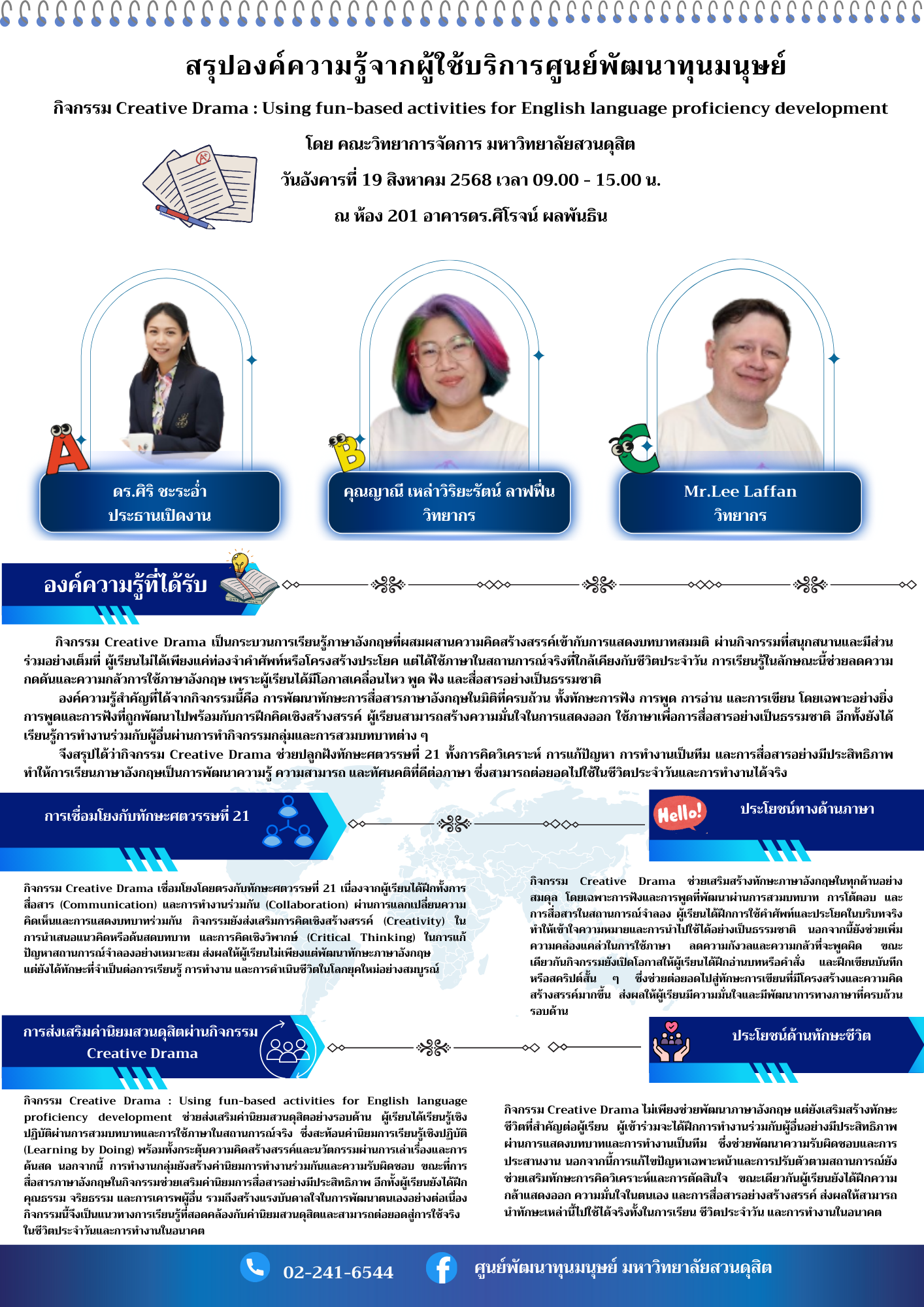 กิจกรรม Creative Drama : Using fun-based activities for English language proficiency development มุ่งเน้นการพัฒนาทักษะภาษาอังกฤษผ่านการเรียนรู้เชิงสร้างสรรค์ โดยใช้กิจกรรมละครและเกมเป็นเครื่องมือในการสื่อสาร ผู้เข้าร่วมจะได้ฝึกการฟัง พูด อ่าน เขียน อย่างเป็นธรรมชาติ ผ่านการทำงานเป็นทีมและการแสดงบทบาทสมมติ กิจกรรมนี้ไม่เพียงช่วยเสริมสร้างความมั่นใจในการใช้ภาษาอังกฤษ แต่ยังสร้างบรรยากาศการเรียนรู้ที่สนุกสนาน ส่งเสริมการคิดสร้างสรรค์ และการเรียนรู้อย่างมีส่วนร่วม