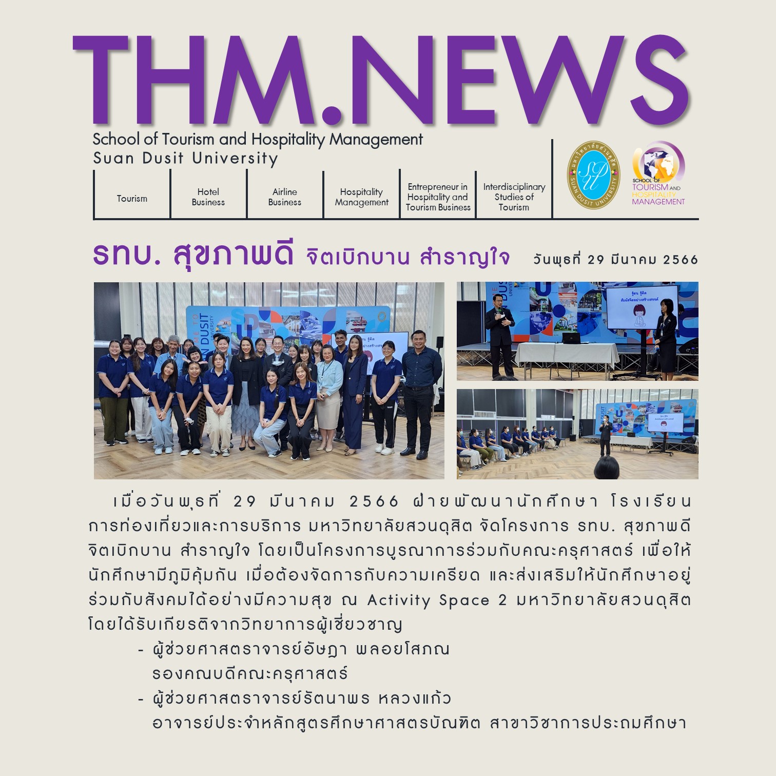 เมื่อวันพุธที่ 29 มีนาคม 2566 ฝ่ายพัฒนานักศึกษา โรงเรียนการท่องเที่ยวและการบริการ มหาวิทยาลัยสวนดุสิต จัดโครงการ รทบ. สุขภาพดี จิตเบิกบาน สำราญใจ โดยเป็นโครงการบูรณาการร่วมกับคณะครุศาสตร์ เพื่อให้นักศึกษามีภูมิคุ้มกัน เมื่อต้องจัดการกับความเครียด และส่งเสริมให้นักศึกษาอยู่ร่วมกับสังคมได้อย่างมีความสุข ณ Activity Space 2 มหาวิทยาลัยสวนดุสิต โดยได้รับเกียรติจากวิทยาการผู้เชี่ยวชาญ