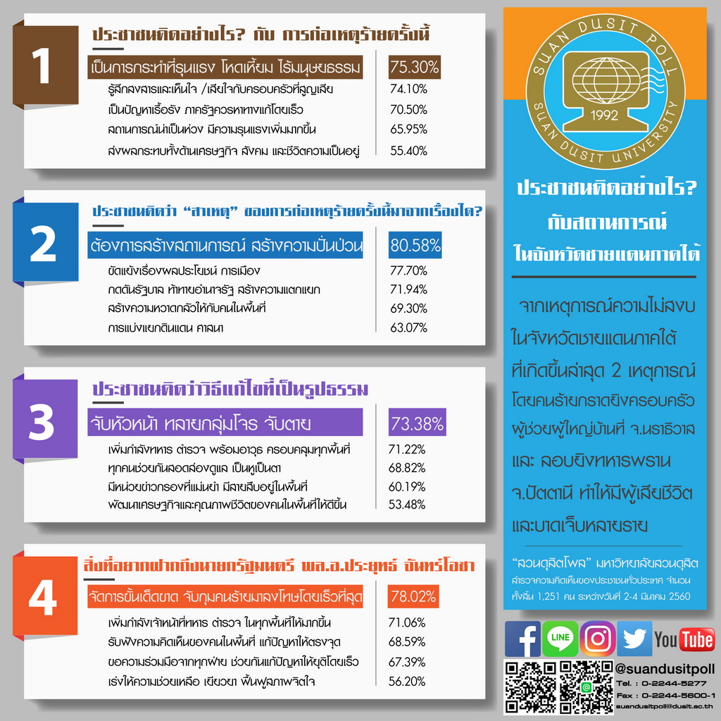 จากเหตุการณ์ความไม่สงบในจังหวัดชายแดนภาคใต้ โดยเฉพาะกรณีกราดยิงครอบครัวผู้ช่วยผู้ใหญ่บ้านใน จ.นราธิวาส และการลอบยิงทหารพรานใน จ.ปัตตานี “สวนดุสิตโพล” ได้ทำการสำรวจความคิดเห็นของประชาชนทั่วประเทศจำนวน 1,251 คน ระหว่างวันที่ 2–4 มีนาคม 2560 ประชาชนส่วนใหญ่ (75.30%) มองว่าเป็นการกระทำที่รุนแรง โหดเหี้ยม และไร้มนุษยธรรม พร้อมทั้งรู้สึกสงสารและเห็นใจกับครอบครัวผู้สูญเสีย (74.10%) โดยเห็นว่าเป็นปัญหาเรื้อรังที่รัฐควรเร่งแก้ไขอย่างจริงจัง และส่งผลกระทบต่อเศรษฐกิจ สังคม และชีวิตความเป็นอยู่ (55.40%) ประชาชนเชื่อว่าสาเหตุหลักของเหตุการณ์มาจากการสร้างสถานการณ์ทางการเมืองและผลประโยชน์ (80.58%) การแก้ไขปัญหาที่เป็นรูปธรรมควรประกอบด้วยการจับกุมหัวหน้าเครือข่าย (73.38%) เพิ่มกำลังเจ้าหน้าที่และข่าวกรอง รวมถึงการพัฒนาเศรษฐกิจในพื้นที่