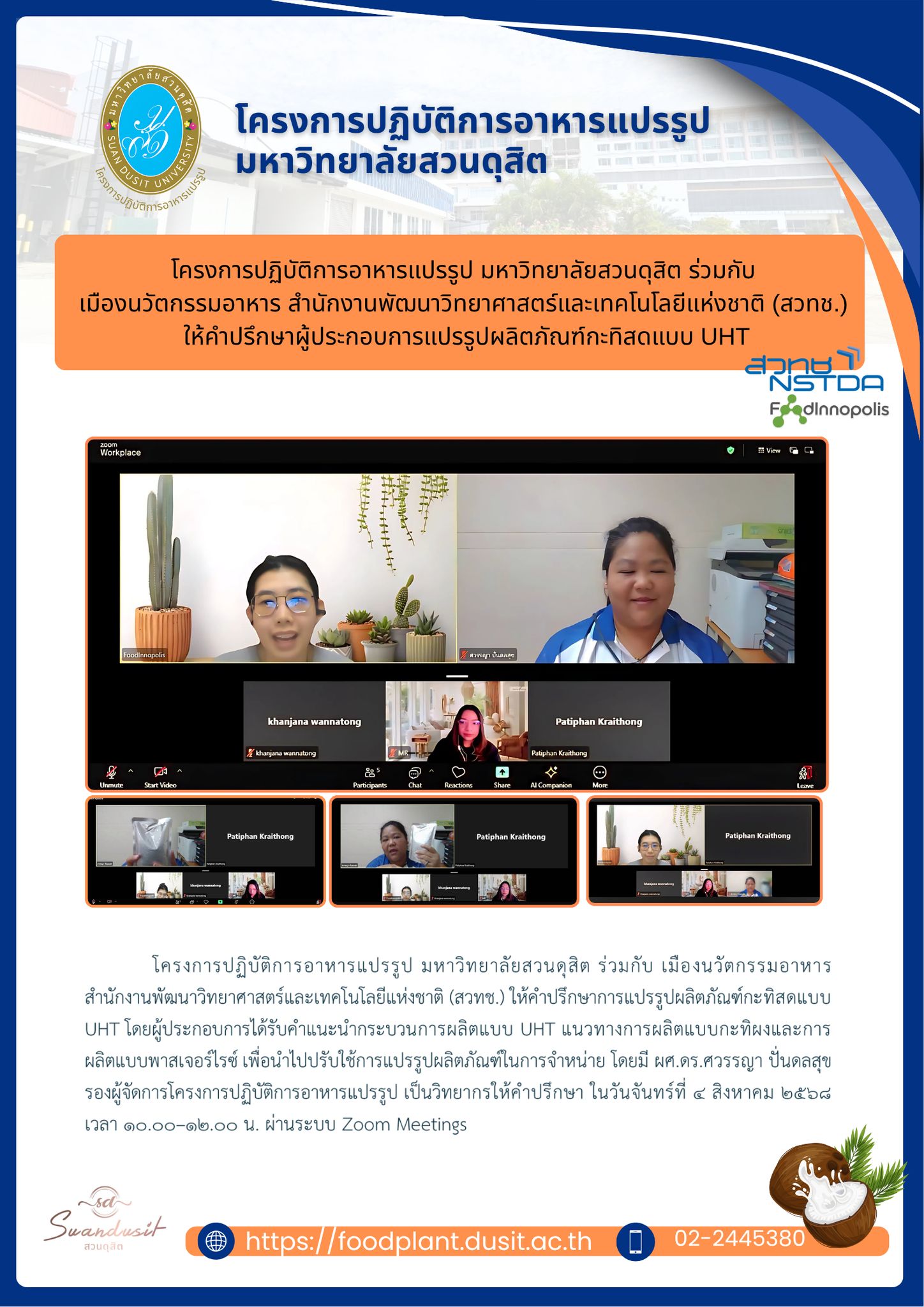 โครงการปฏิบัติการอาหารแปรรูป มหาวิทยาลัยสวนดุสิต ร่วมกับ เมืองนวัตกรรมอาหาร สำนักงานพัฒนาวิทยาศาสตร์และเทคโนโลยีแห่งชาติ (สวทช.) ให้คำปรึกษาการแปรรูปผลิตภัณฑ์กะทิสดแบบ UHT