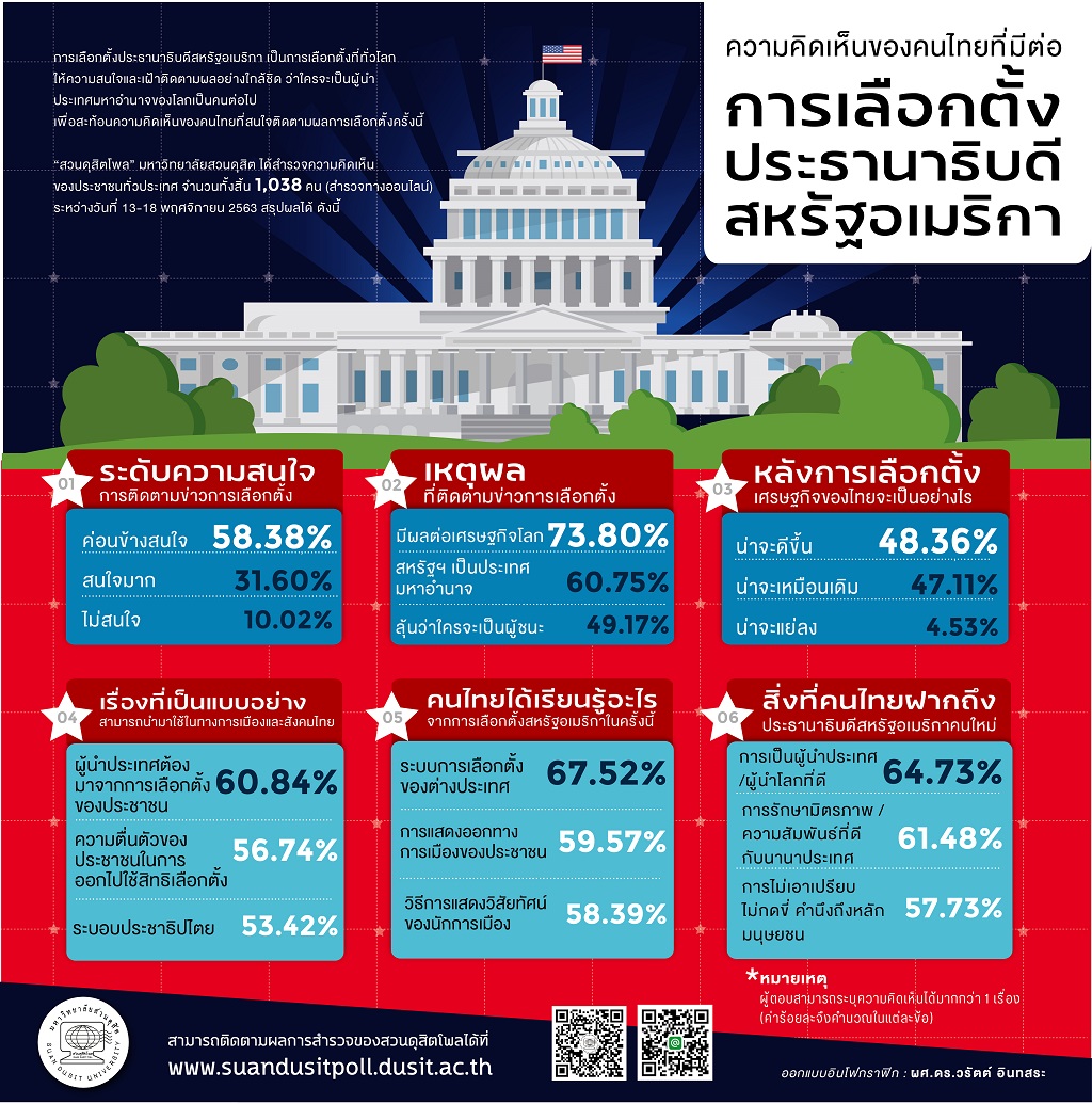 สวนดุสิตโพล มหาวิทยาลัยสวนดุสิต ได้สำรวจความคิดเห็นของประชาชนไทยจำนวน 1,038 คน ระหว่างวันที่ 13–18 พฤศจิกายน 2563 เกี่ยวกับการเลือกตั้งประธานาธิบดีสหรัฐอเมริกา ปี 2020 ซึ่งเป็นการเลือกตั้งที่ทั่วโลกให้ความสนใจ ผลสำรวจพบว่า คนไทยร้อยละ 89.98 สนใจติดตามข่าวการเลือกตั้ง โดยเหตุผลหลักคือมีผลต่อเศรษฐกิจโลก (73.80%) และเพราะสหรัฐฯ เป็นประเทศมหาอำนาจ (60.75%) คนไทยร้อยละ 48.36 เชื่อว่าเศรษฐกิจไทยจะดีขึ้นหลังการเลือกตั้ง และเห็นว่าแบบอย่างที่ดีจากการเลือกตั้งครั้งนี้คือผู้นำต้องมาจากการเลือกตั้ง (60.84%) สิ่งที่ได้เรียนรู้ ได้แก่ ระบบเลือกตั้งของต่างประเทศ และการแสดงออกทางการเมืองของประชาชน ขณะที่สิ่งที่อยากฝากถึงประธานาธิบดีคนใหม่คือการเป็นผู้นำโลกที่ดี และให้ความสำคัญกับมิตรภาพระหว่างประเทศ รวมถึงการเคารพสิทธิมนุษยชน