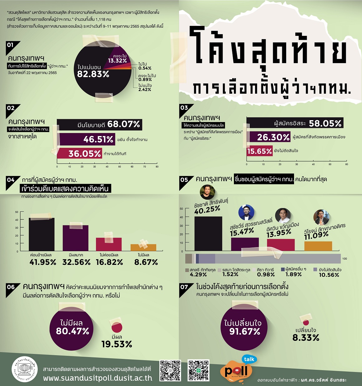 การเลือกตั้งผู้ว่าราชการกรุงเทพมหานครในวันที่ 22 พฤษภาคม 2565 มีการสำรวจความคิดเห็นของประชาชนที่มีสิทธิเลือกตั้ง จำนวน 1,118 คน ระหว่างวันที่ 9–11 พฤษภาคม พบว่า ร้อยละ 82.83 ตั้งใจจะไปใช้สิทธิเลือกตั้ง โดยประชาชนส่วนใหญ่ให้ความสำคัญกับนโยบายของผู้สมัคร ร้อยละ 68.07 รองลงมาคือความขยันและสามารถทำงานได้ทันที นอกจากนี้ ผู้สมัครอิสระยังคงได้รับความสนใจมากกว่าผู้สมัครที่สังกัดพรรคการเมือง โดยชัชชาติ สิทธิพันธุ์ เป็นผู้สมัครที่ได้รับความนิยมสูงสุด รองลงมาคือ สุชัชวีร์ สุวรรณสวัสดิ์ และอัศวิน ขวัญเมือง การเข้าร่วมเวทีดีเบตของผู้สมัครมีอิทธิพลต่อการตัดสินใจเลือกตั้ง โดยเฉพาะในกลุ่ม First Time Voters ซึ่งให้ความสำคัญกับการดีเบตและการเป็นคนรุ่นใหม่ แม้ผลสำรวจระบุว่าคะแนนนิยมจากโพลต่าง ๆ ไม่มีผลต่อการตัดสินใจในภาพรวม แต่ในกลุ่มเยาวชนกลับมีแนวโน้มที่จะได้รับอิทธิพลมากกว่า การตัดสินใจของคนกรุงเทพฯ ในช่วงโค้งสุดท้ายส่วนใหญ่มีความชัดเจนและไม่เปลี่ยนใจ