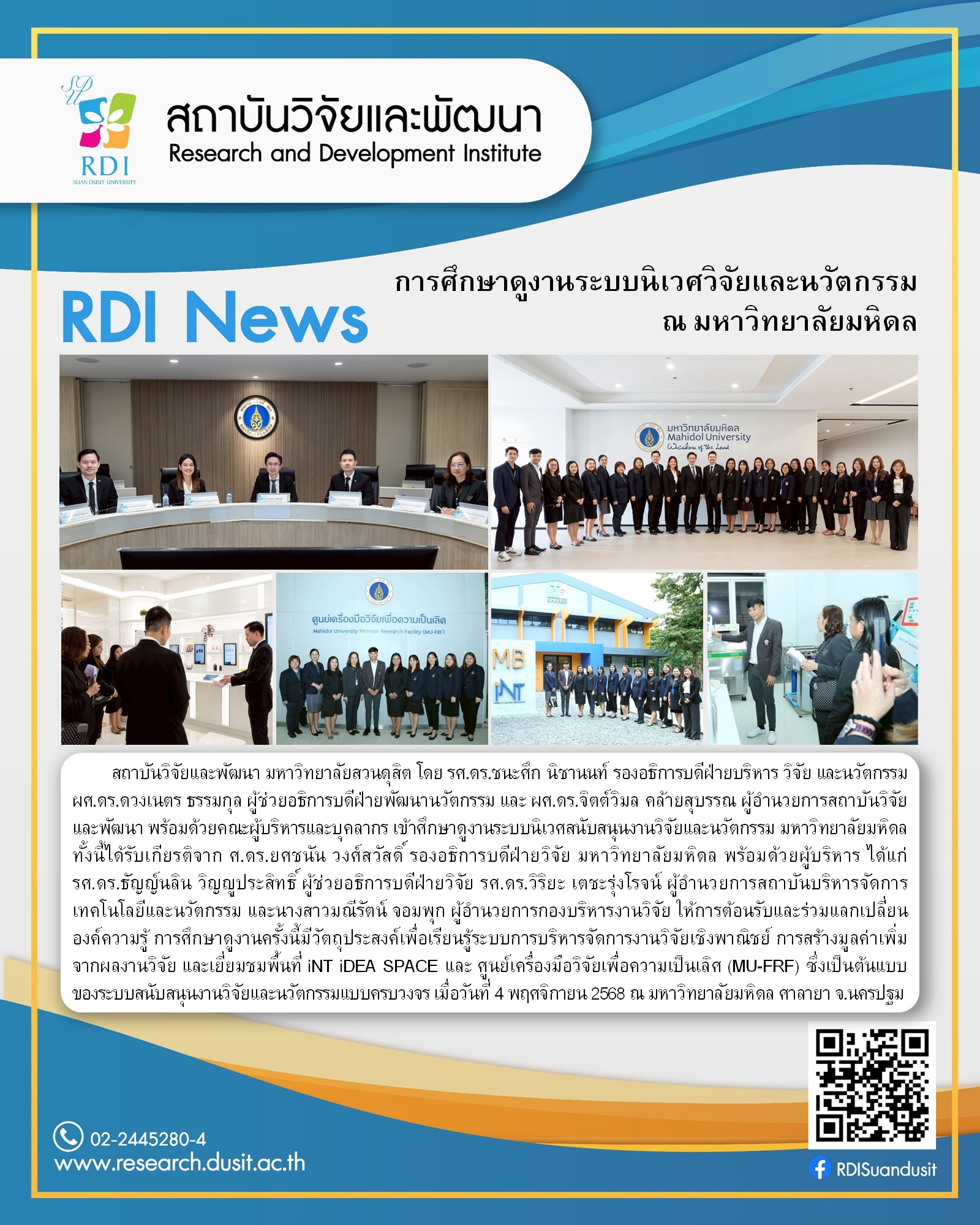 สถาบันวิจัยและพัฒนา มหาวิทยาลัยสวนดุสิต โดย รศ.ดร.ชนะศึก นิชานนท์ รองอธิการบดีฝ่ายบริหาร วิจัย และนวัตกรรม ผศ.ดร.ดวงเนตร ธรรมกุล ผู้ช่วยอธิการบดีฝ่ายพัฒนานวัตกรรม และ ผศ.ดร.จิตต์วิมล คล้ายสุบรรณ ผู้อำนวยการสถาบันวิจัยและพัฒนา พร้อมด้วยคณะผู้บริหารและบุคลากร เข้าศึกษาดูงานระบบนิเวศสนับสนุนงานวิจัยและนวัตกรรม มหาวิทยาลัยมหิดล ทั้งนี้ได้รับเกียรติจาก ศ.ดร.ยศชนัน วงศ์สวัสดิ์ รองอธิการบดีฝ่ายวิจัย มหาวิทยาลัยมหิดล พร้อมด้วยผู้บริหาร ได้แก่ รศ.ดร.ธัญญ์นลิน วิญญูประสิทธิ์ ผู้ช่วยอธิการบดีฝ่ายวิจัย รศ.ดร.วิริยะ เตชะรุ่งโรจน์ ผู้อำนวยการสถาบันบริหารจัดการเทคโนโลยีและนวัตกรรม และนางสาวมณีรัตน์ จอมพุก ผู้อำนวยการกองบริหารงานวิจัย ให้การต้อนรับและร่วมแลกเปลี่ยนองค์ความรู้ การศึกษาดูงานครั้งนี้มีวัตถุประสงค์เพื่อเรียนรู้ระบบการบริหารจัดการงานวิจัยเชิงพาณิชย์ การสร้างมูลค่าเพิ่มจากผลงานวิจัย และเยี่ยมชมพื้นที่ iNT iDEA SPACE และ ศูนย์เครื่องมือวิจัยเพื่อความเป็นเลิศ (MU-FRF) ซึ่งเป็นต้นแบบของระบบสนับสนุนงานวิจัยและนวัตกรรมแบบครบวงจร เมื่อวันที่ 4 พฤศจิกายน 2568 ณ มหาวิทยาลัยมหิดล ศาลายา จ.นครปฐม