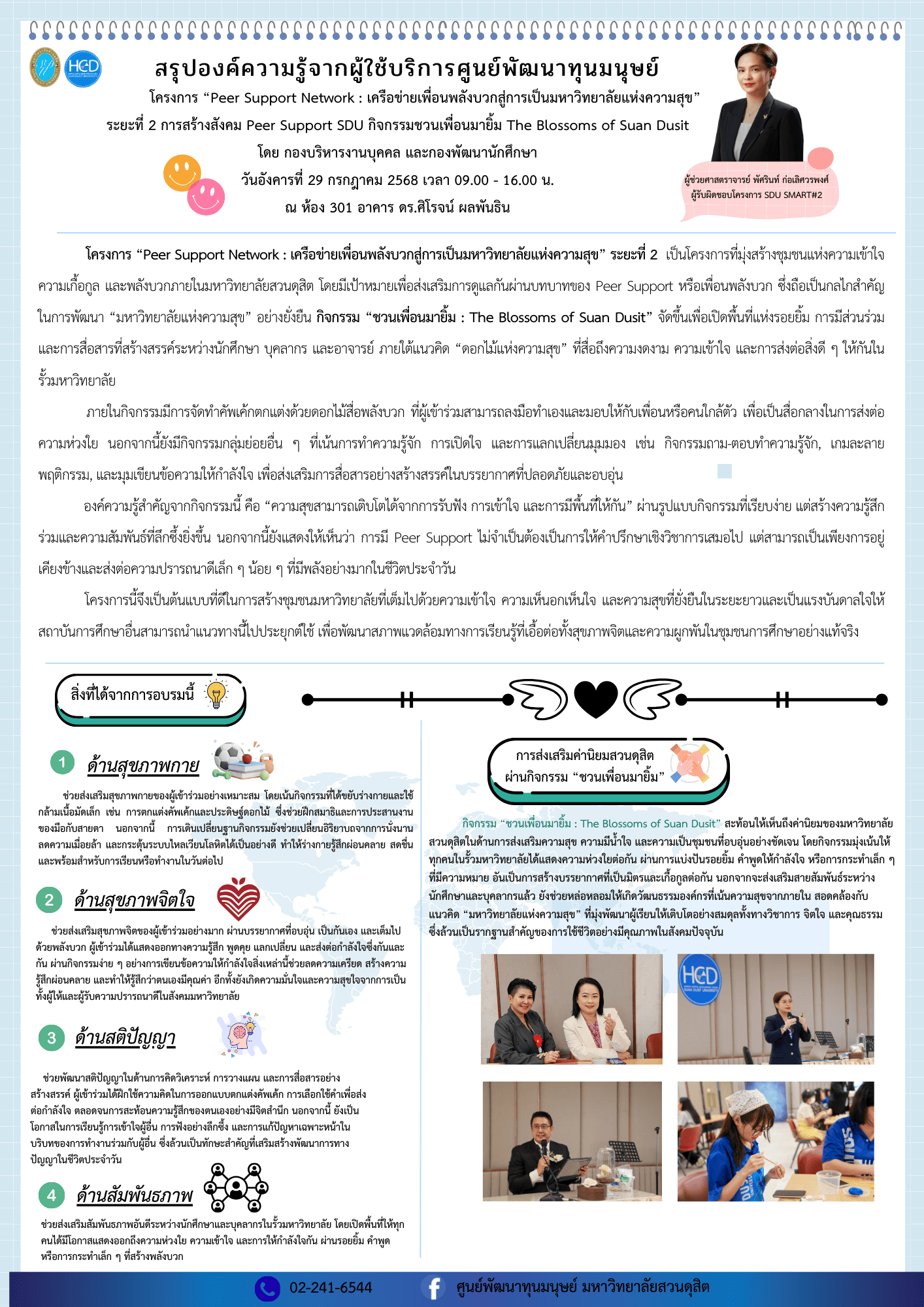 โครงการ Peer Support Network : เครือข่ายเพื่อนพลังบวกสู่การเป็นมหาวิทยาลัยแห่งความสุข ระยะที่ 2 ภายใต้แนวคิดการสร้างสังคม Peer Support SDU จัดทำขึ้นเพื่อส่งเสริมความสุขและสร้างแรงบันดาลใจในชุมชนมหาวิทยาลัย ผ่านการสร้างเครือข่ายเพื่อนพลังบวกที่มีบทบาทในการสนับสนุน ดูแล และส่งเสริมเพื่อนร่วมสังคมในด้านอารมณ์และจิตใจ กิจกรรม The Blossoms of Suan Dusit เป็นหนึ่งในโครงการย่อยที่เน้นการสร้างความสัมพันธ์เชิงบวก ผ่านการสื่อสาร การทำกิจกรรมร่วมกัน และการแลกเปลี่ยนประสบการณ์ ส่งผลให้ผู้เข้าร่วมเกิดความมั่นใจในการสื่อสาร ทักษะการทำงานร่วมกัน และความรู้สึกเชื่อมโยงกับชุมชนมหาวิทยาลัย
