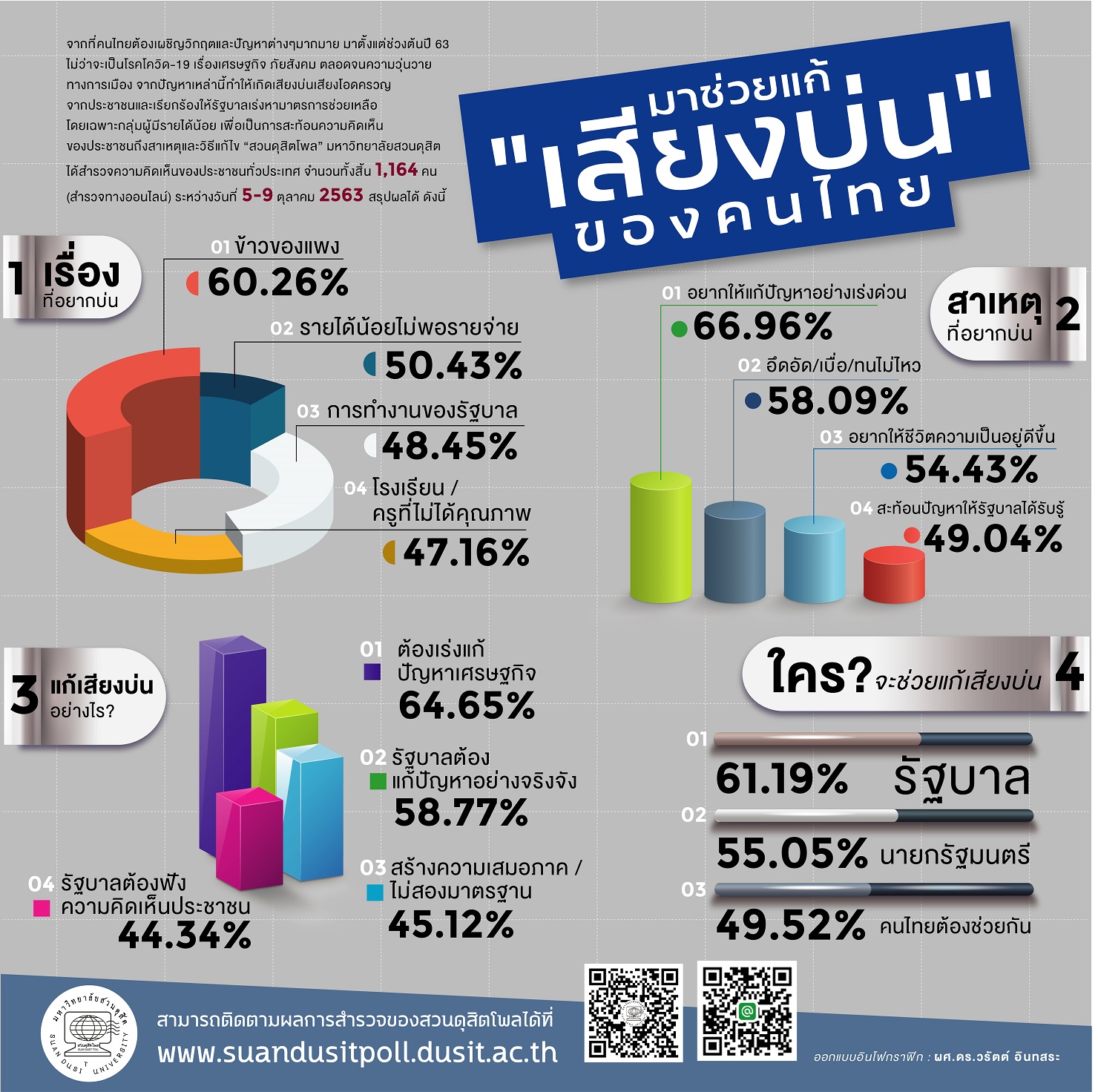 สวนดุสิตโพล มหาวิทยาลัยสวนดุสิต ได้ทำการสำรวจความคิดเห็นของประชาชนจำนวน 1,164 คน ระหว่างวันที่ 5–9 ตุลาคม 2563 เพื่อตรวจสอบปัญหาที่คนไทยบ่นถึงมากที่สุดในช่วงวิกฤตเศรษฐกิจและสังคมจากสถานการณ์โควิด-19 ผลสำรวจพบว่า ประเด็นที่ประชาชนบ่นมากที่สุดคือ “ข้าวของแพง” (60.26%) รองลงมาคือ “รายได้น้อยไม่พอรายจ่าย” และ “การทำงานของรัฐบาล” โดยสาเหตุของเสียงบ่นส่วนใหญ่เกิดจากความต้องการให้แก้ไขปัญหาอย่างเร่งด่วนและความอึดอัดต่อสถานการณ์ปัจจุบัน วิธีการแก้ไขที่ประชาชนคาดหวังคือการเร่งฟื้นเศรษฐกิจ การบริหารอย่างจริงจัง และการฟังเสียงประชาชนอย่างแท้จริง ทั้งนี้ ประชาชนมองว่ารัฐบาลและนายกรัฐมนตรีควรเป็นผู้นำหลักในการจัดการปัญหาเหล่านี้ ขณะเดียวกันประชาชนเองก็พร้อมมีส่วนร่วม สะท้อนความต้องการเปลี่ยนแปลงผ่าน “เสียงบ่น” ที่ไม่ควรถูกมองข้าม