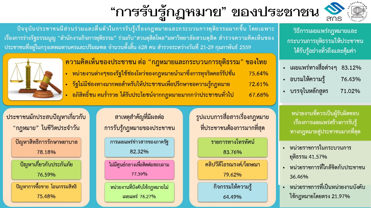 การศึกษานี้เป็นผลการสำรวจความคิดเห็นของประชาชนจำนวน 628 คนในเขตกรุงเทพมหานครและปริมณฑล โดยสำนักงานกิจการยุติธรรมร่วมกับสวนดุสิตโพล มหาวิทยาลัยสวนดุสิต เพื่อศึกษาการรับรู้ของประชาชนเกี่ยวกับกฎหมายและกระบวนการยุติธรรม ผลการสำรวจพบว่าประชาชนส่วนใหญ่มองว่าหน่วยงานรัฐใช้ช่องโหว่ของกฎหมายก่อให้เกิดการทุจริต และประชาชนยังขาดช่องทางเข้าถึงความรู้ทางกฎหมายอย่างเพียงพอ โดยปัญหากฎหมายที่พบมากในชีวิตประจำวัน ได้แก่ สิทธิด้านสุขภาพ ประกันภัย และการซื้อขายทรัพย์สิน นอกจากนี้ การเผยแพร่กฎหมายโดยภาครัฐยังไม่สอดคล้องกับความต้องการของประชาชน ซึ่งแสดงถึงความจำเป็นในการปรับปรุงรูปแบบการสื่อสาร เช่น รายการโทรทัศน์ คลิปวิดีโอ และอินโฟกราฟิก รวมทั้งการส่งเสริมบทบาทของหน่วยงานยุติธรรมในการให้ความรู้ ความเข้าใจทางกฎหมาย เพื่อให้ประชาชนสามารถเข้าถึงสิทธิและกระบวนการยุติธรรมได้อย่างเท่าเทียมและทั่วถึง