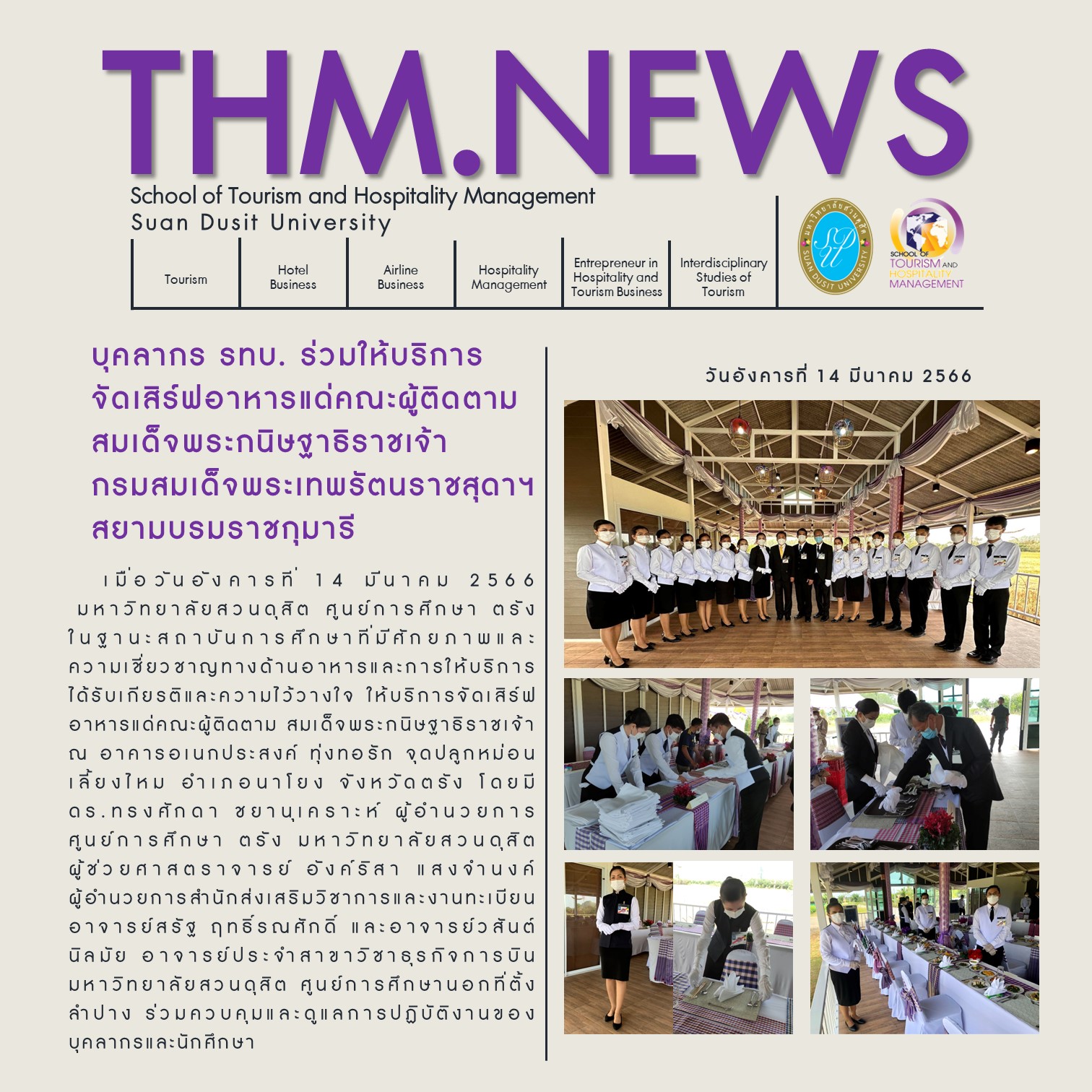 เมื่อวันอังคารที่ 14 มีนาคม 2566 มหาวิทยาลัยสวนดุสิต ศูนย์การศึกษา ตรัง ในฐานะสถาบันการศึกษาที่มีศักยภาพและความเชี่ยวชาญทางด้านอาหารและการให้บริการ ได้รับเกียรติและความไว้วางใจ ให้บริการจัดเสิร์ฟอาหารแด่คณะผู้ติดตาม สมเด็จพระกนิษฐาธิราชเจ้า ณ อาคารอเนกประสงค์ ทุ่งทอรัก จุดปลูกหม่อนเลี้ยงไหม อำเภอนาโยง จังหวัดตรัง โดยมี ดร.ทรงศักดา ชยานุเคราะห์ ผู้อำนวยการศูนย์การศึกษา ตรัง มหาวิทยาลัยสวนดุสิต ผู้ช่วยศาสตราจารย์ อังค์ริสา แสงจำนงค์ ผู้อำนวยการสำนักส่งเสริมวิชาการและงานทะเบียน อาจารย์สรัฐ ฤทธิ์รณศักดิ์ และอาจารย์วสันต์ นิลมัย อาจารย์ประจำสาขาวิชาธุรกิจการบิน มหาวิทยาลัยสวนดุสิต ศูนย์การศึกษานอกที่ตั้ง ลำปาง ร่วมควบคุมและดูแลการปฏิบัติงานของบุคลากรและนักศึกษา