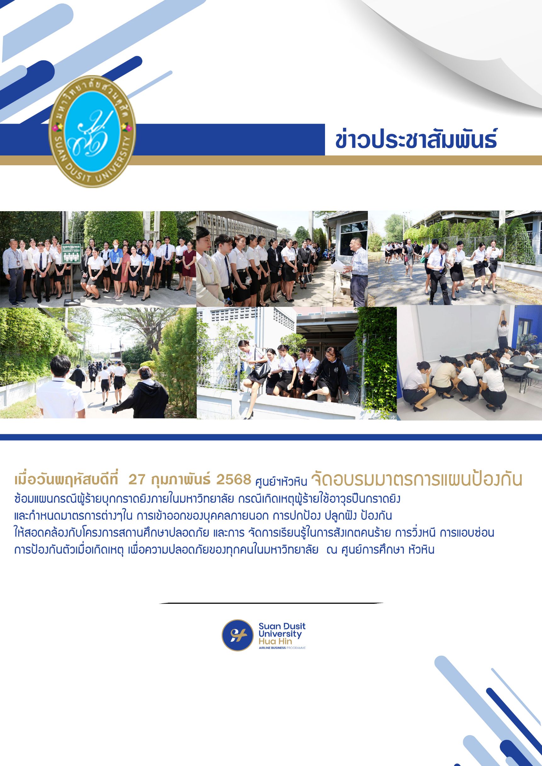 | dc.description.abstract | เมื่อ วันพฤหัสบดี ที่ 27 กุมภาพันธ์ 2568 ศูนย์การศึกษา หัวหิน จัดอบรมมาตรการแผนป้องกัน " ซ้อมแผนกรณีผู้ร้ายบุกกราดยิงภายในมหาวิทยาลัย กรณีเกิดเหตุผู้ร้ายใช้อาวุธปืนกราดยิง และกำหนดมาตรการต่างๆใน การเข้าออกของบุคคลภายนอก การปกป้อง ปลูกฝัง ป้องกัน ให้สอดคล้องกับโครงการสถานศึกษาปลอดภัย และการจัดการเรียนรู้ในการสังเกตคนร้าย การวิ่งหนี การแอบซ่อน การป้องกันตัวเมื่อเกิดเหตุ เพื่อความปลอดภัยของทุกคนในมหาวิทยาลัย ณ ศูนย์การศึกษา หัวหิน | |