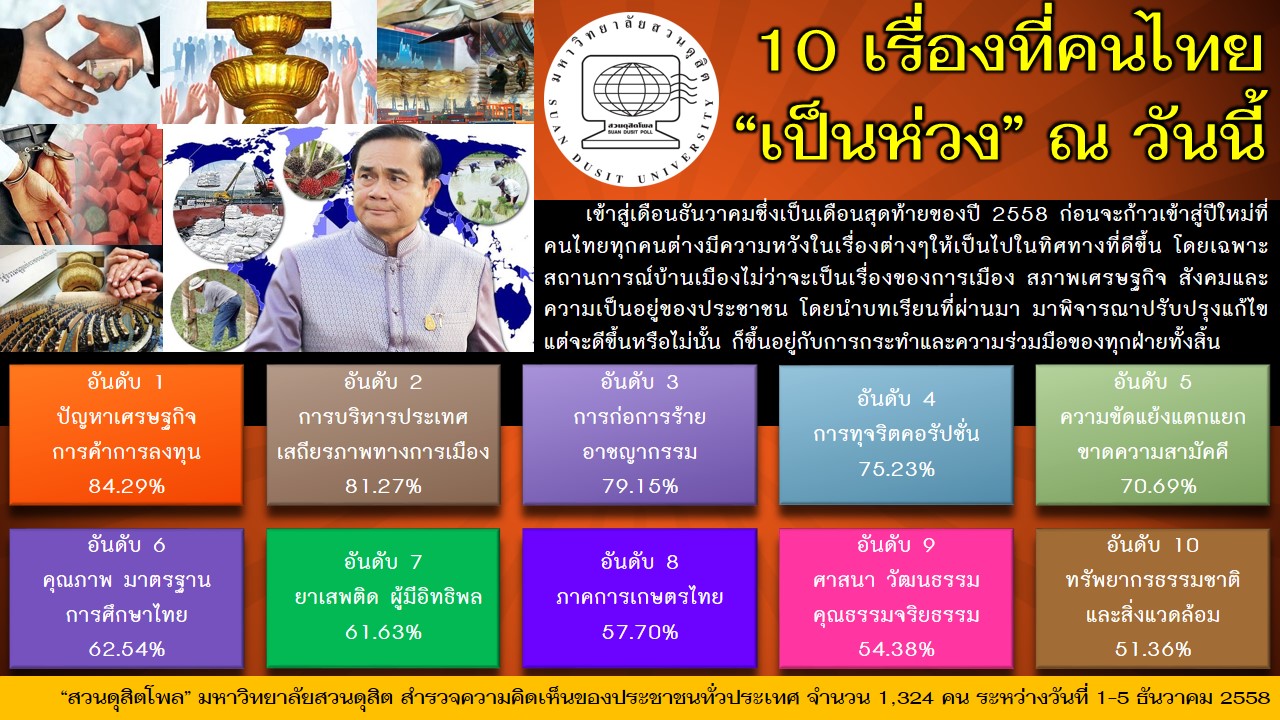 การสำรวจความคิดเห็นประชาชนทั่วประเทศโดยสวนดุสิตโพล มหาวิทยาลัยสวนดุสิต ระหว่างวันที่ 1–5 ธันวาคม 2558 มีวัตถุประสงค์เพื่อสะท้อนความห่วงกังวลของประชาชนต่อสถานการณ์ต่าง ๆ ของประเทศในช่วงปลายปี พบว่า 10 เรื่องที่คนไทยเป็นห่วงมากที่สุด ได้แก่ ปัญหาเศรษฐกิจ การบริหารประเทศ เสถียรภาพทางการเมือง การก่อการร้ายและอาชญากรรม การทุจริตคอร์รัปชัน ความขัดแย้งในสังคม ระบบการศึกษา ปัญหายาเสพติด สภาพชีวิตของเกษตรกร การเสื่อมถอยของศาสนาและวัฒนธรรม และการทำลายทรัพยากรธรรมชาติและสิ่งแวดล้อม ทั้งนี้ประชาชนเสนอแนวทางป้องกันและแก้ไขที่เน้นบทบาทของภาครัฐในการจัดการปัญหาอย่างจริงจัง โปร่งใส และมีการมีส่วนร่วมของประชาชน สะท้อนให้เห็นถึงความตระหนักและความหวังของคนไทยต่อการพัฒนาประเทศในทุกมิติ พร้อมข้อเสนอแนะเพื่อสร้างความมั่นคงและยั่งยืนในอนาคต