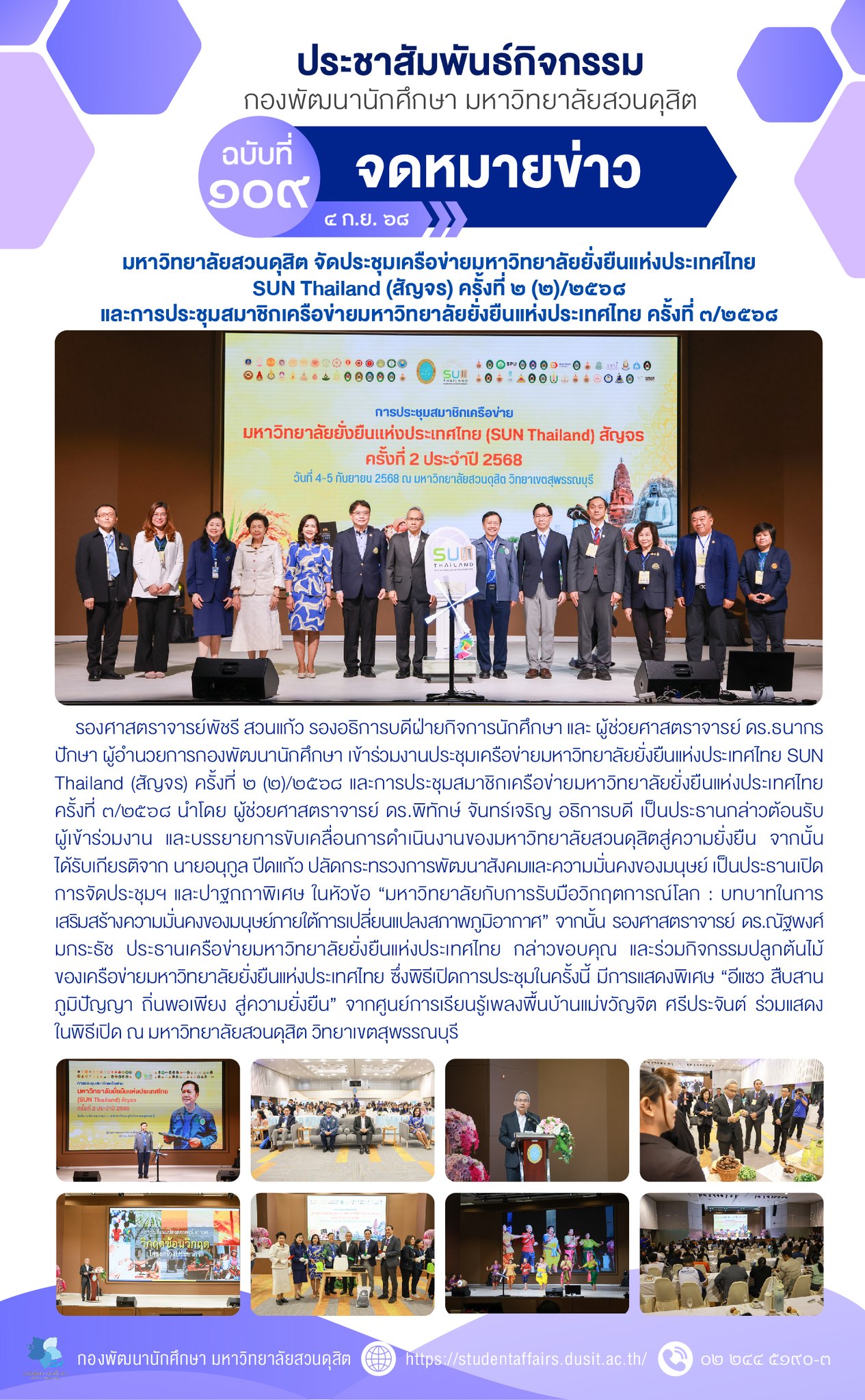 รองศาสตราจารย์พัชรี สวนแก้ว รองอธิการบดีฝ่ายกิจการนักศึกษา และ ผู้ช่วยศาสตราจารย์ ดร.ธนากร ปักษา ผู้อำนวยการกองพัฒนานักศึกษา เข้าร่วมงานประชุมเครือข่ายมหาวิทยาลัยยั่งยืนแห่งประเทศไทย SUN Thailand (สัญจร) ครั้งที่ ๒ (๒)/๒๕๖๘ และการประชุมสมาชิกเครือข่ายมหาวิทยาลัยยั่งยืนแห่งประเทศไทย ครั้งที่ ๓/๒๕๖๘ นำโดย ผู้ช่วยศาสตราจารย์ ดร.พิทักษ์ จันทร์เจริญ อธิการบดี เป็นประธานกล่าวต้อนรับผู้เข้าร่วมงาน และบรรยายการขับเคลื่อนการดำเนินงานของมหาวิทยาลัยสวนดุสิตสู่ความยั่งยืน