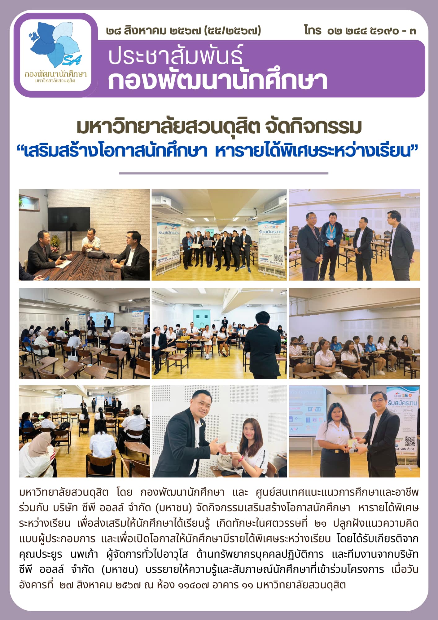 มหาวิทยาลัยสวนดุสิต โดย กองพัฒนานักศึกษา และ ศูนย์สนเทศแนะแนวการศึกษาและอาชีพ ร่วมกับ บริษัท ซีพี ออลล์ จำกัด (มหาชน) จัดกิจกรรมเสริมสร้างโอกาสนักศึกษา หารายได้พิเศษระหว่างเรียน เพื่อส่งเสริมให้นักศึกษาได้เรียนรู้ เกิดทักษะในศตวรรษที่ ๒๑ ปลูกฝังแนวความคิดแบบผู้ประกอบการ และเพื่อเปิดโอกาสให้นักศึกษามีรายได้พิเศษระหว่างเรียน โดยได้รับเกียรติจาก คุณประยูร นพเก้า ผู้จัดการทั่วไปอาวุโส ด้านทรัพยากรบุคคลปฏิบัติการ และทีมงานจากบริษัท ซีพี ออลล์ จำกัด (มหาชน) บรรยายให้ความรู้และสัมภาษณ์นักศึกษาที่เข้าร่วมโครงการ เมื่อวันอังคารที่ ๒๗ สิงหาคม ๒๕๖๗ ณ ห้อง ๑๑๔๐๗ อาคาร ๑๑ มหาวิทยาลัยสวนดุสิต