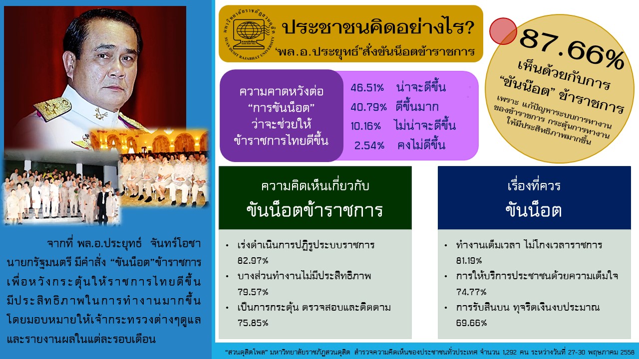 จากกรณีที่พลเอกประยุทธ์ จันทร์โอชา นายกรัฐมนตรี มีคำสั่ง “ขันน็อต” ข้าราชการเพื่อยกระดับประสิทธิภาพของระบบราชการไทย สวนดุสิตโพล มหาวิทยาลัยราชภัฏสวนดุสิต ได้จัดทำการสำรวจความคิดเห็นของประชาชนทั่วประเทศ จำนวน 1,292 คน ระหว่างวันที่ 27–30 พฤษภาคม 2558 เพื่อสะท้อนมุมมองของประชาชนต่อแนวทางดังกล่าว ผลการสำรวจพบว่า ประชาชนส่วนใหญ่เห็นด้วยกับการปฏิรูประบบราชการอย่างจริงจัง โดยให้ความสำคัญกับการทำงานเต็มเวลา ไม่ทุจริต และปรับปรุงคุณภาพการให้บริการแก่ประชาชน นอกจากนี้ ประชาชนคาดหวังว่า การดำเนินการนี้จะช่วยกระตุ้นให้ข้าราชการมีความรับผิดชอบ มีคุณภาพ และเป็นประโยชน์ต่อประเทศในระยะยาว ทั้งนี้ ยังมีข้อเสนอแนะให้มีหน่วยงานภายนอกเข้ามาตรวจสอบเพื่อความโปร่งใสและลดปัญหาการใช้ระบบพวกพ้อง ซึ่งสะท้อนถึงความต้องการให้เกิดการเปลี่ยนแปลงเชิงโครงสร้างอย่างแท้จริงในระบบราชการไทย
