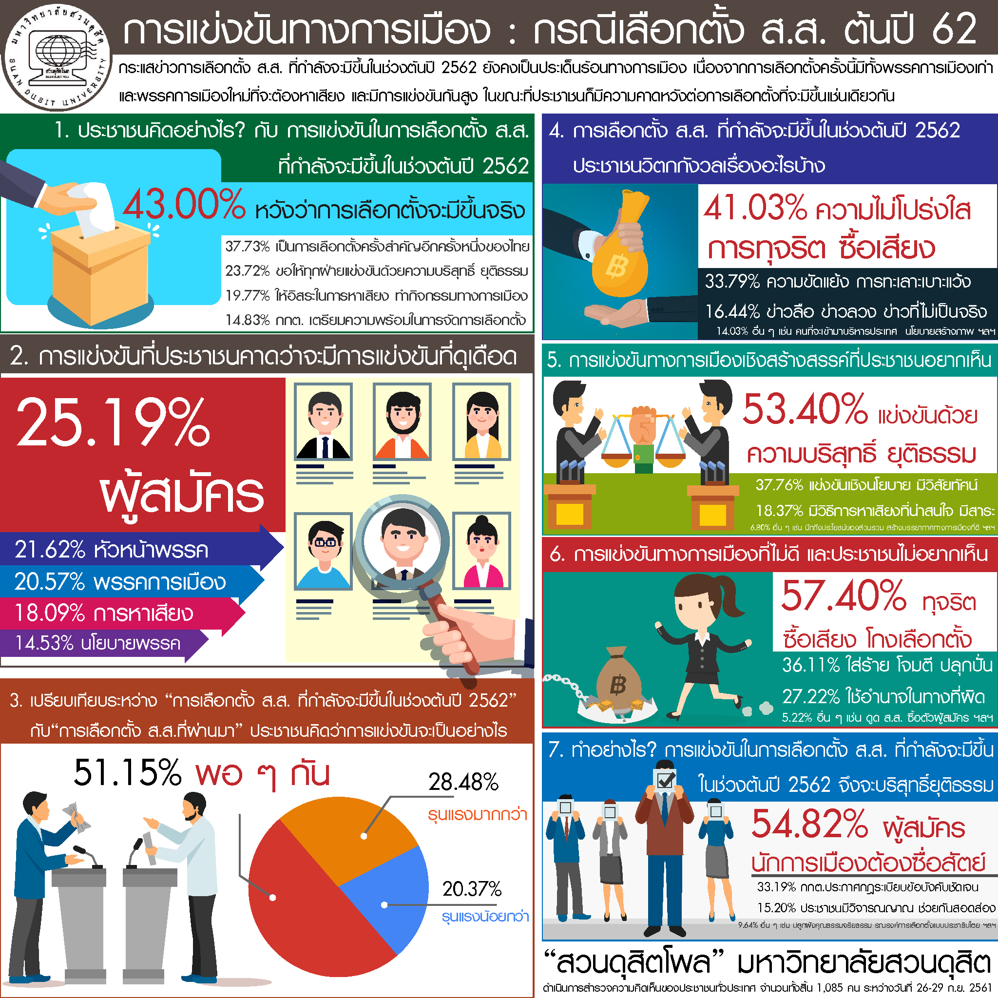 จากกระแสการเลือกตั้ง ส.ส. ที่จะเกิดขึ้นในช่วงต้นปี 2562 ซึ่งเป็นการเลือกตั้งครั้งสำคัญหลังจากเว้นว่างมาหลายปี “สวนดุสิตโพล” ได้ทำการสำรวจความคิดเห็นของประชาชนจำนวน 1,085 คน ระหว่างวันที่ 26–29 กันยายน 2561 เพื่อสะท้อนมุมมองต่อการแข่งขันทางการเมืองในบริบทใหม่ พบว่าประชาชนส่วนใหญ่ (43.00%) หวังว่าจะมีการกำหนดวันเลือกตั้งอย่างแน่นอน และมองว่าเป็นการแข่งขันทางการเมืองที่มีความเข้มข้นและสำคัญต่ออนาคตประเทศ ประชาชนกังวลเรื่องความไม่โปร่งใส การทุจริต และซื้อเสียง (41.03%) ขณะที่การแข่งขันที่อยากเห็นคือแบบสร้างสรรค์ เน้นนโยบายที่เป็นรูปธรรม และดำเนินการด้วยความยุติธรรม (53.40%) กลุ่มที่คาดว่าจะมีการแข่งขันดุเดือดที่สุดคือผู้สมัคร ส.ส. รายบุคคล และหัวหน้าพรรค เพื่อให้การเลือกตั้งเป็นธรรม ประชาชนเสนอให้ผู้สมัครต้องซื่อสัตย์ กกต.มีบทบาทควบคุมที่ชัดเจน และประชาชนมีส่วนร่วมตรวจสอบ ช่วยกันสร้างบรรยากาศทางการเมืองที่โปร่งใสและส่งเสริมประชาธิปไตย
