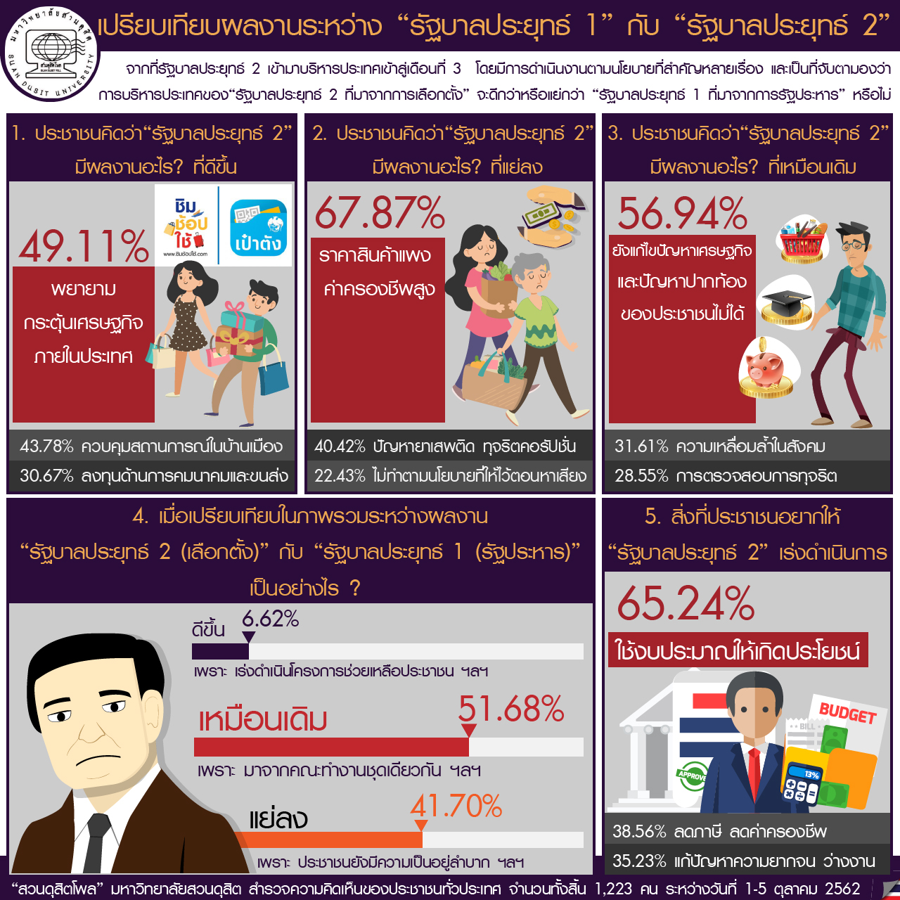 เพื่อประเมินผลงานของรัฐบาลประยุทธ์ 2 ซึ่งมาจากการเลือกตั้ง เมื่อเปรียบเทียบกับรัฐบาลประยุทธ์ 1 ที่มาจากการรัฐประหาร การสำรวจความคิดเห็นจากประชาชนจำนวน 1,223 คน ระหว่างวันที่ 1–5 ตุลาคม 2562 พบว่า ประชาชนเห็นว่ารัฐบาลประยุทธ์ 2 มีความพยายามในการกระตุ้นเศรษฐกิจ เช่น โครงการ “ชิมช้อปใช้” (49.11%) และมีการลงทุนด้านคมนาคมเพิ่มขึ้น อย่างไรก็ตาม รัฐบาลชุดนี้ยังคงไม่สามารถแก้ไขปัญหาปากท้องได้อย่างชัดเจน (56.94%) ค่าครองชีพยังสูง และยังคงมีการทุจริตคอร์รัปชัน การประเมินในภาพรวมพบว่า 51.68% มองว่าผลงาน “เหมือนเดิม” เนื่องจากเป็นทีมงานชุดเดิม ขณะที่ 41.70% มองว่า “แย่ลง” และมีเพียง 6.62% ที่มองว่า “ดีขึ้น” ข้อเสนอหลักของประชาชนคือ การใช้งบประมาณอย่างคุ้มค่า (65.24%) ลดภาษีและค่าครองชีพ รวมถึงการสร้างงานให้ผู้ว่างงาน เพื่อฟื้นฟูเศรษฐกิจอย่างเป็นรูปธรรม