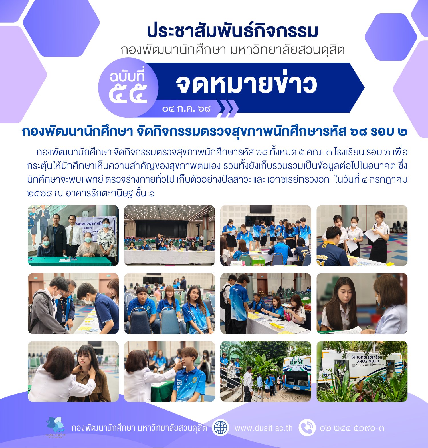 กองพัฒนานักศึกษา จัดกิจกรรมตรวจสุขภาพนักศึกษารหัส ๖๘ ทั้งหมด ๕ คณะ ๓ โรงเรียน รอบ ๒ เพื่อกระตุ้นให้นักศึกษาเห็นความสำคัญของสุขภาพตนเอง รวมทั้งยังเก็บรวบรวมเป็นข้อมูลต่อไปในอนาคต ซึ่งนักศึกษาจะพบแพทย์ ตรวจร่างกายทั่วไป เก็บตัวอย่างปัสสาวะ และ เอกซเรย์ทรวงอก ในวันที่ ๔ กรกฎาคม ๒๕๖๘ ณ อาคารรักตะกนิษฐ ชั้น ๑