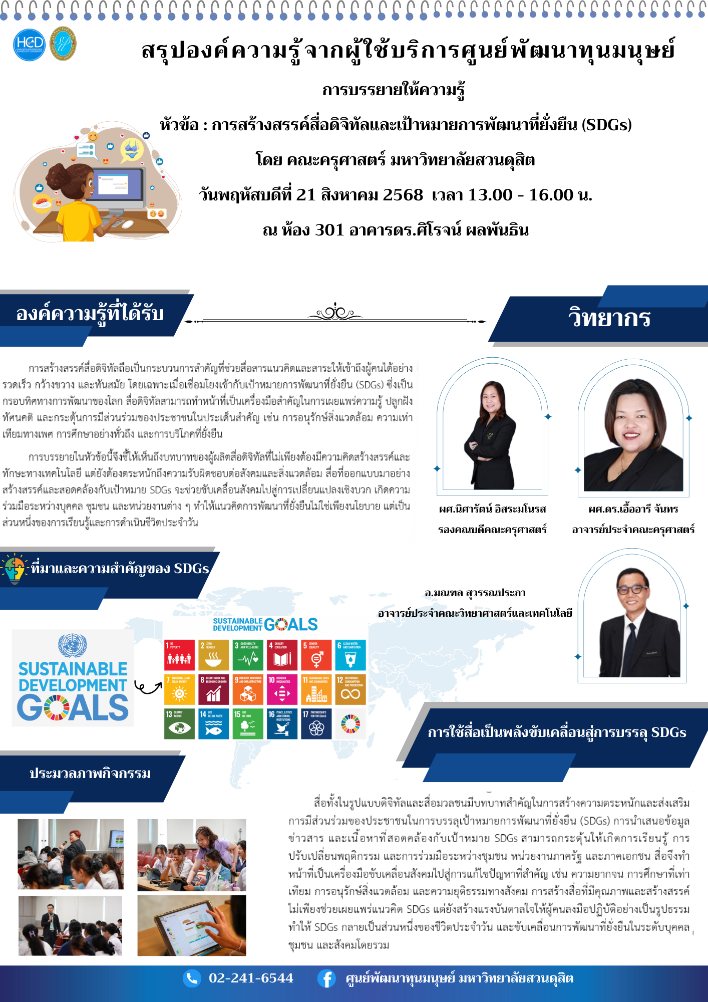 การบรรยายให้ความรู้หัวข้อ “การสร้างสรรค์สื่อดิจิทัลและเป้าหมายการพัฒนาที่ยั่งยืน (SDGs)” จัดขึ้นเพื่อเสริมสร้างความรู้และทักษะในการออกแบบสื่อดิจิทัลที่มีคุณค่าและสื่อสารแนวคิดการพัฒนาที่ยั่งยืนอย่างมีประสิทธิภาพ ผู้เข้าร่วมจะได้เรียนรู้เทคนิคการสร้างสรรค์เนื้อหา การนำเสนอ และการประยุกต์ใช้สื่อดิจิทัลเพื่อส่งเสริมความเข้าใจในเป้าหมาย SDGs ทั้งในด้านการศึกษา งานวิชาการ และการสร้างสังคมที่ยั่งยืน