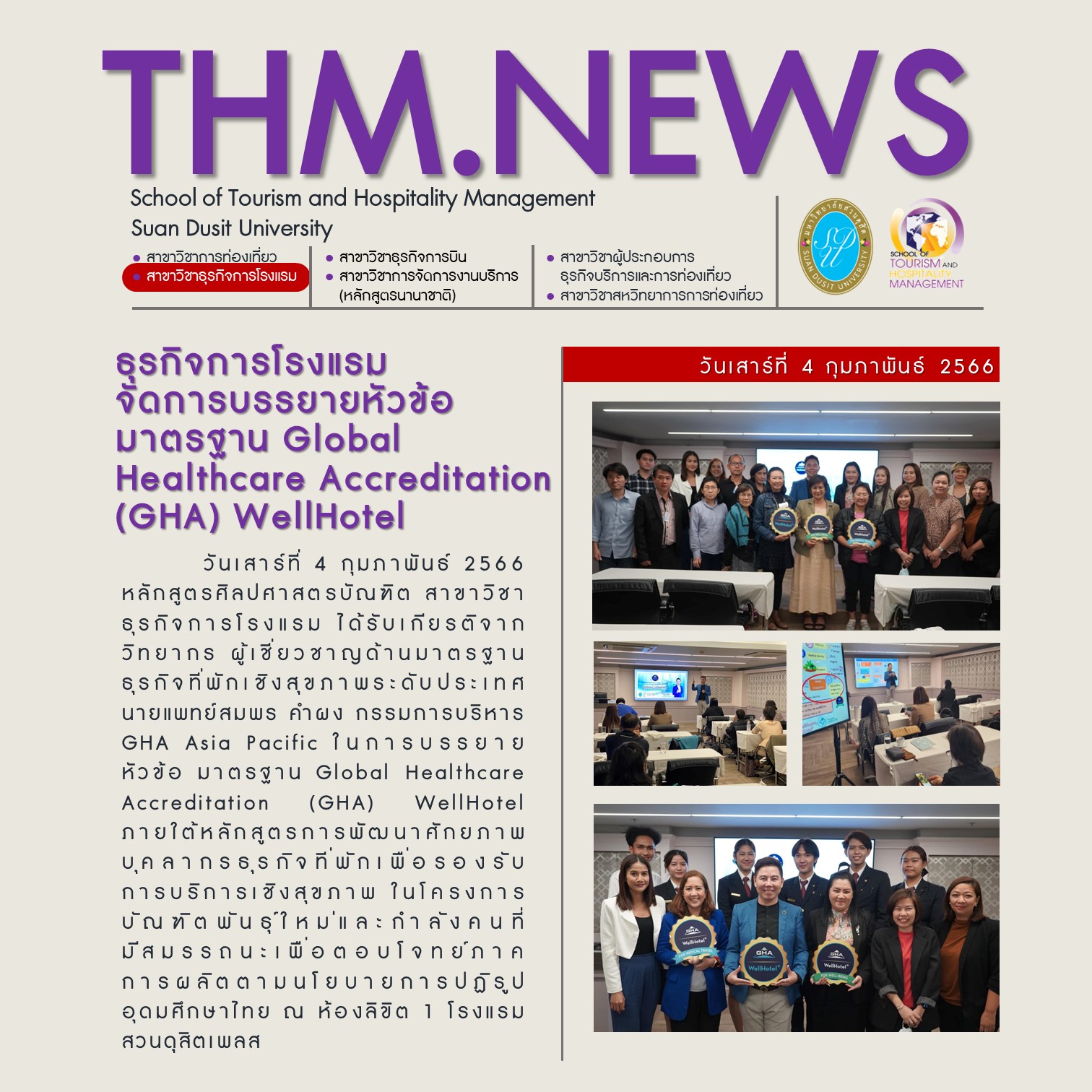 เมื่อวันเสาร์ที่ 4 กุมภาพันธ์ 2566 หลักสูตรศิลปศาสตรบัณฑิต สาขาวิชาธุรกิจการโรงแรม ได้รับเกียรติจากวิทยากร ผู้เชี่ยวชาญด้านมาตรฐานธุรกิจที่พักเชิงสุขภาพระดับประเทศ นายแพทย์สมพร คำผง กรรมการบริหาร GHA Asia Pacific ในการบรรยายหัวข้อ มาตรฐาน Global Healthcare Accreditation (GHA) WellHotel ภายใต้หลักสูตรการพัฒนาศักยภาพบุคลากรธุรกิจที่พักเพื่อรองรับการบริการเชิงสุขภาพ ในโครงการบัณฑิตพันธุ์ใหม่และกำลังคนที่มีสมรรถนะเพื่อตอบโจทย์ภาค การผลิตตามนโยบายการปฏิรูปอุดมศึกษาไทย ณ ห้องลิขิต 1 โรงแรมสวนดุสิตเพลส